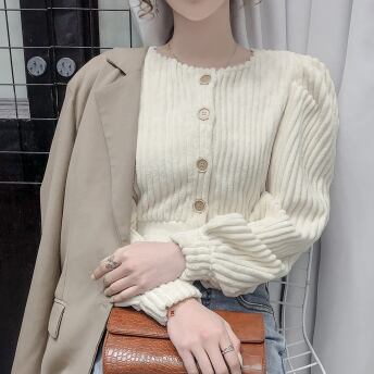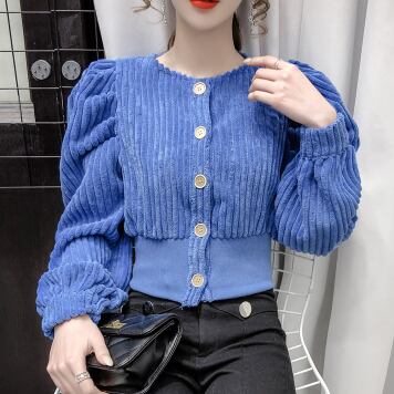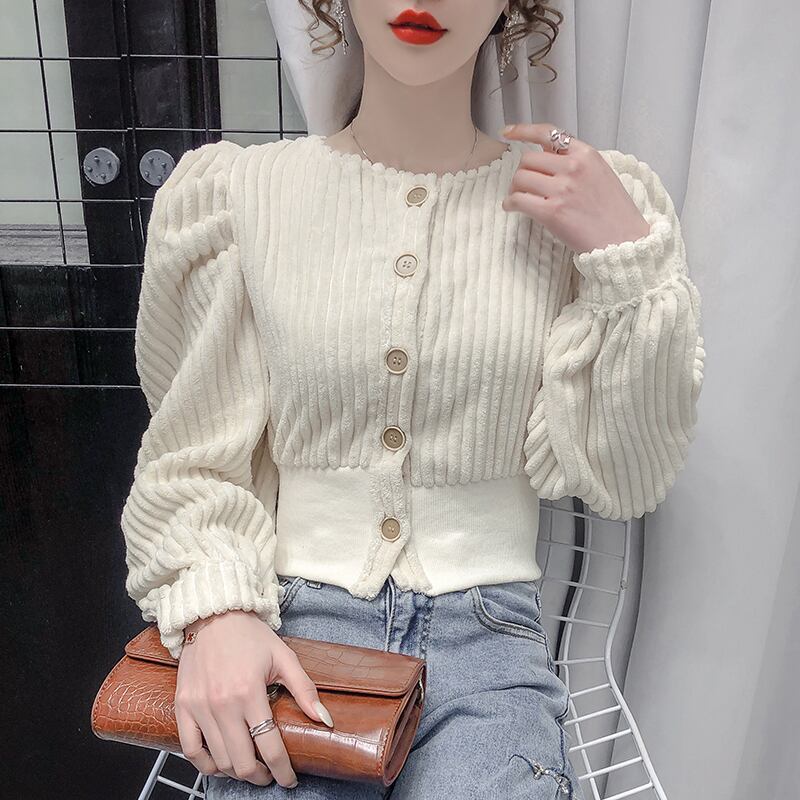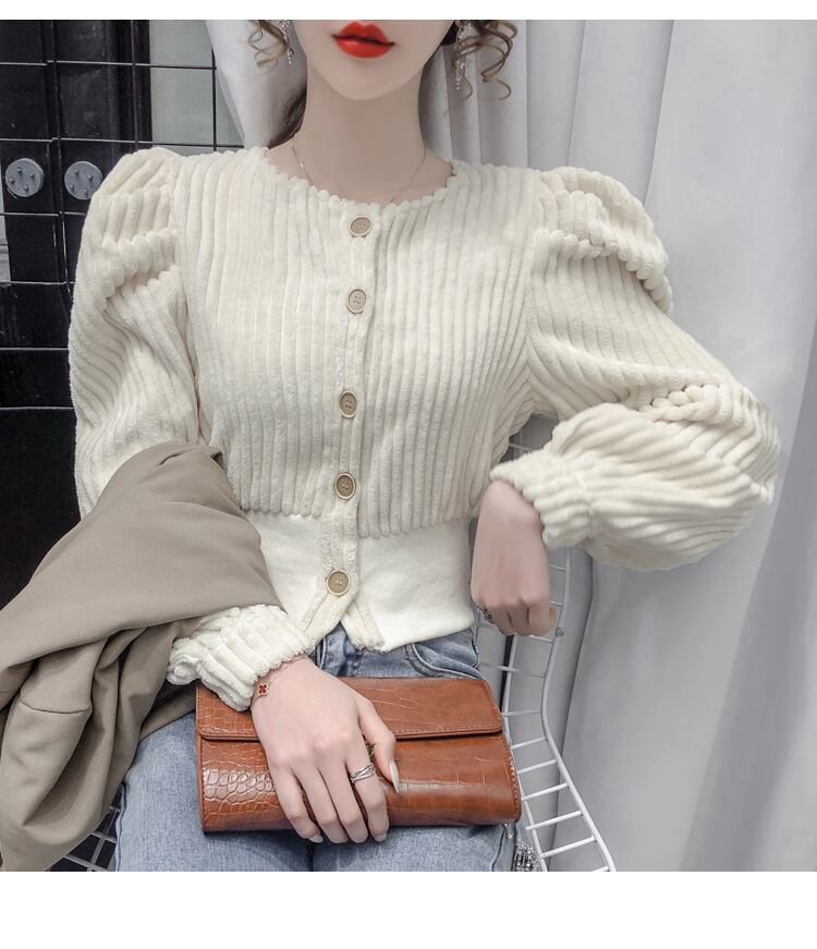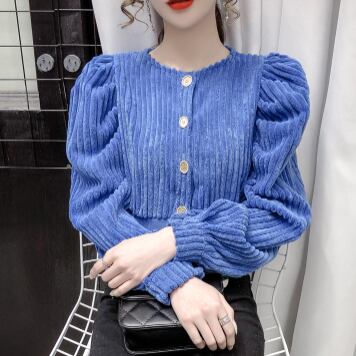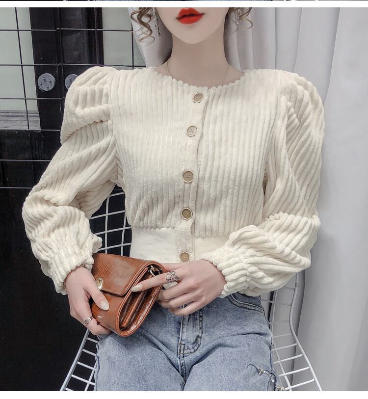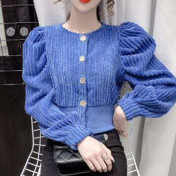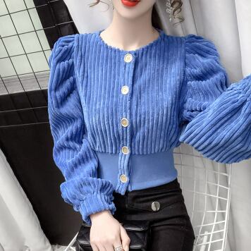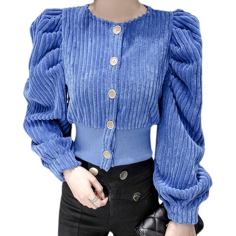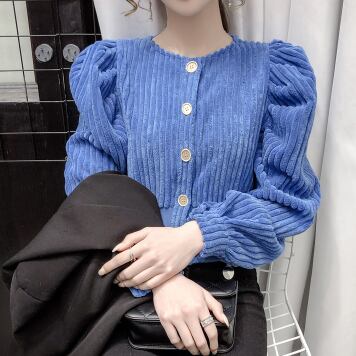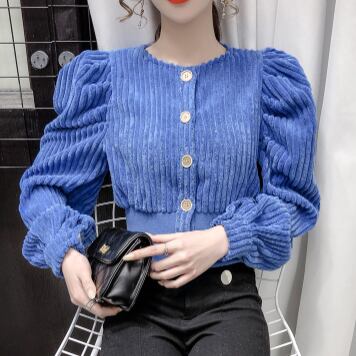 ショート丈シャツ トップス クラシック アプリコット ブルー 青 ミニ丈 ショート丈 袖あり 長袖 ボリューム袖 ラウンドネック スリム 細身 シングルブレスト ボタン コーデュロイ 大人女子 大人 上品 おしゃれ きれいめ シンプル モード系 エレガント レトロ レトロ風 こなれ感 ラフ 個性的 デザイン 主役級 存在感 無地 秋 冬 10代 20代 30代 レディース 女性用 オフィス ビジネス OL デート お出かけ 女子会 着回し 普段使い S M L XL 2XL