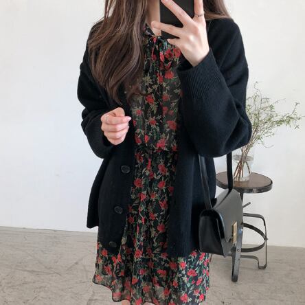 大きめのボタンが可愛いニットカーディガンです。