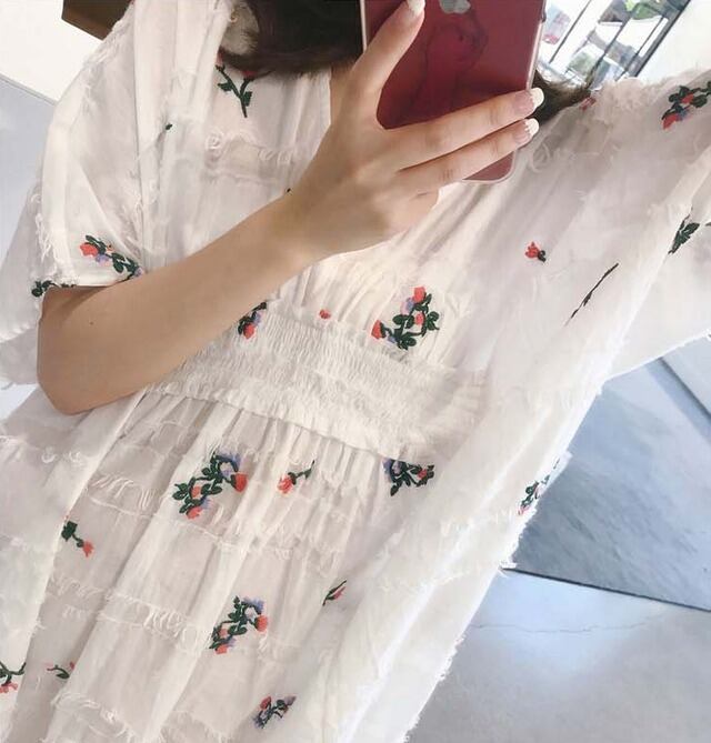 ピンクの花刺繍がアクセントのフローラルワンピースです。
