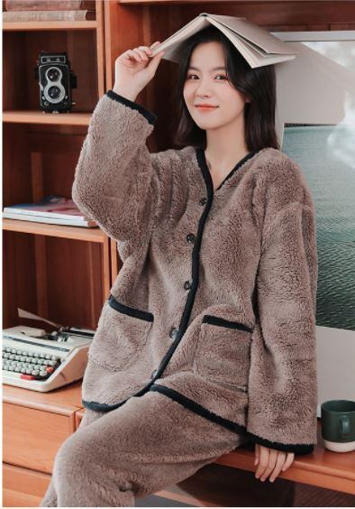 寒い冬にピッタリのベルベットパジャマが、新入荷しました!もこもこでふわふわの質感が女性らしさを演出し、大人女子にもぴったり。袖ありで長袖、Vネックで襟なしのデザインは、シンプルながらもこなれ感を漂わせます。前開きがついているので、着替えも楽チンです。おしゃれでかわいい、定番の無地デザインで、普段使いから旅行先まで幅広く着こなせます。防寒効果もあるので、外出の際のインナーとしても重宝します。