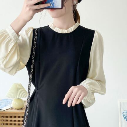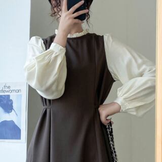 このワンピースは、大人可愛いデザインのロング丈ワンピースです。Aラインでフリルが付いているため、体型カバーにもなり、華奢見えも叶います。