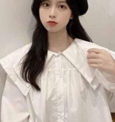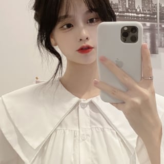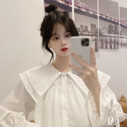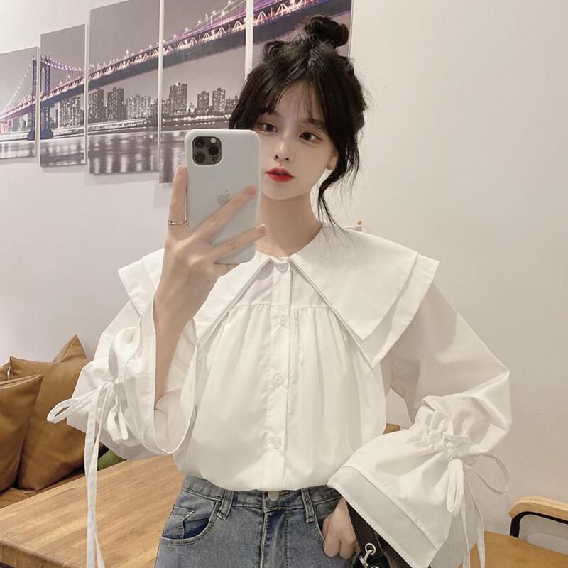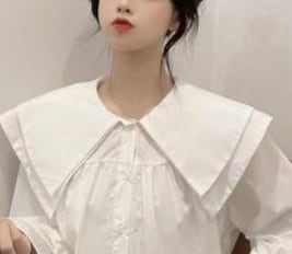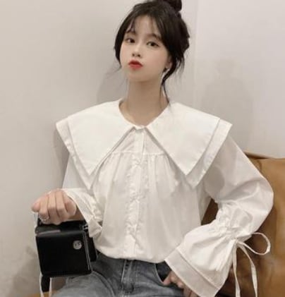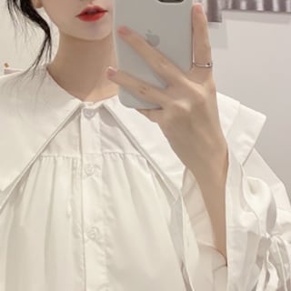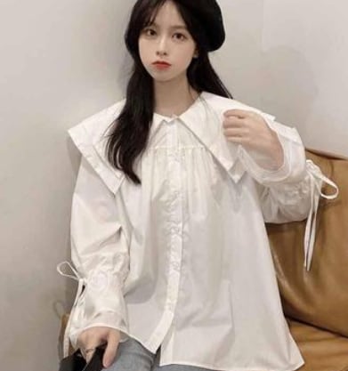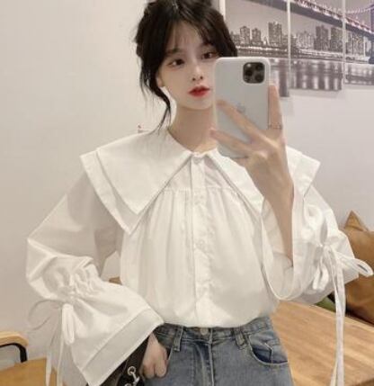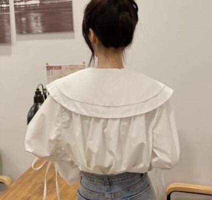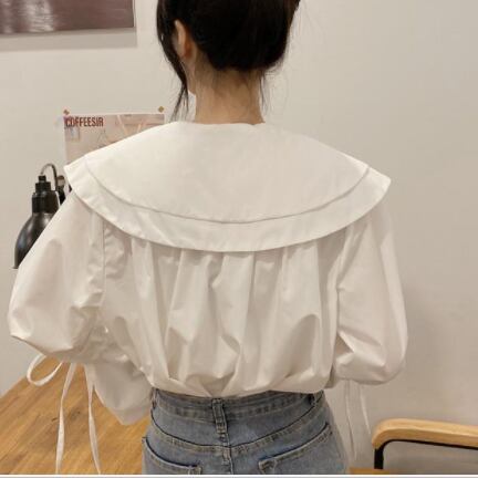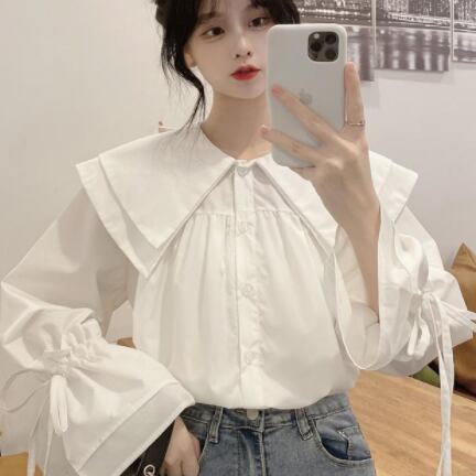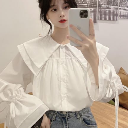 ボリューム袖と大きめの襟がかわいい長そで白ブラウスです。