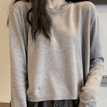 長袖セーターのご紹介です。カラーバリエーション豊富なこの一枚は、ラウンドネックでベーシックなデザイン。ショート丈で襟なしなので、スカートやパンツと合わせたスタイリングが映えます。ストレートなシルエットは、体のラインを拾わず、着膨れせずスマートな印象です。グレー、ブルー、ピンク、ブラックなど、大人女子が使いやすい色展開も魅力のひとつです。