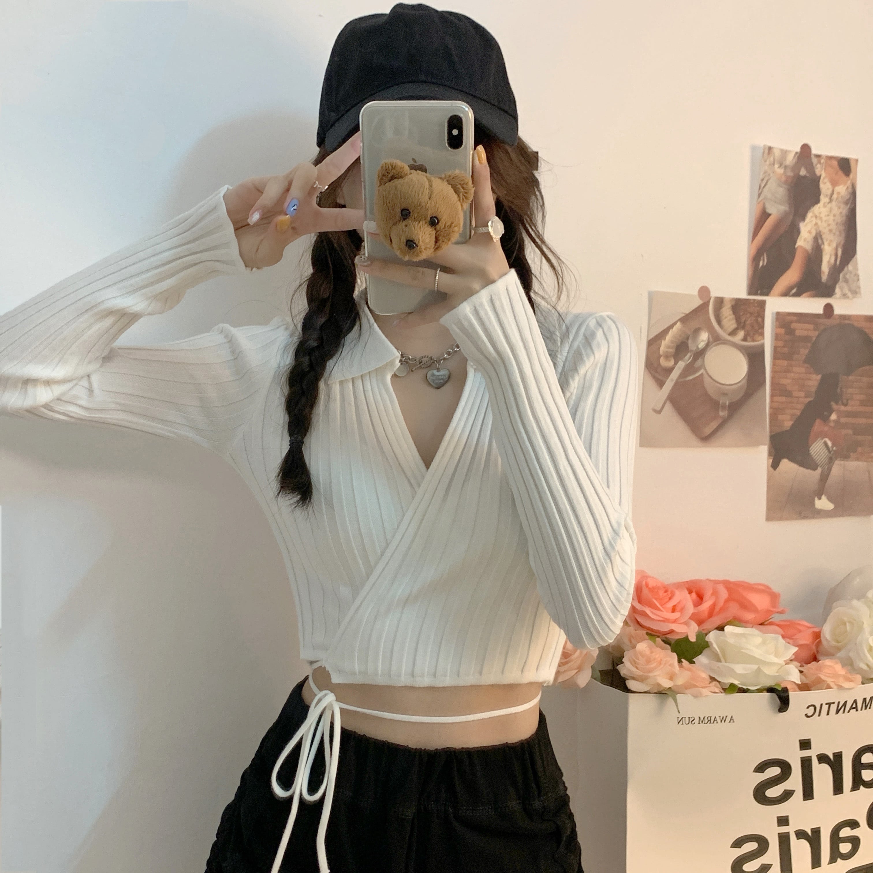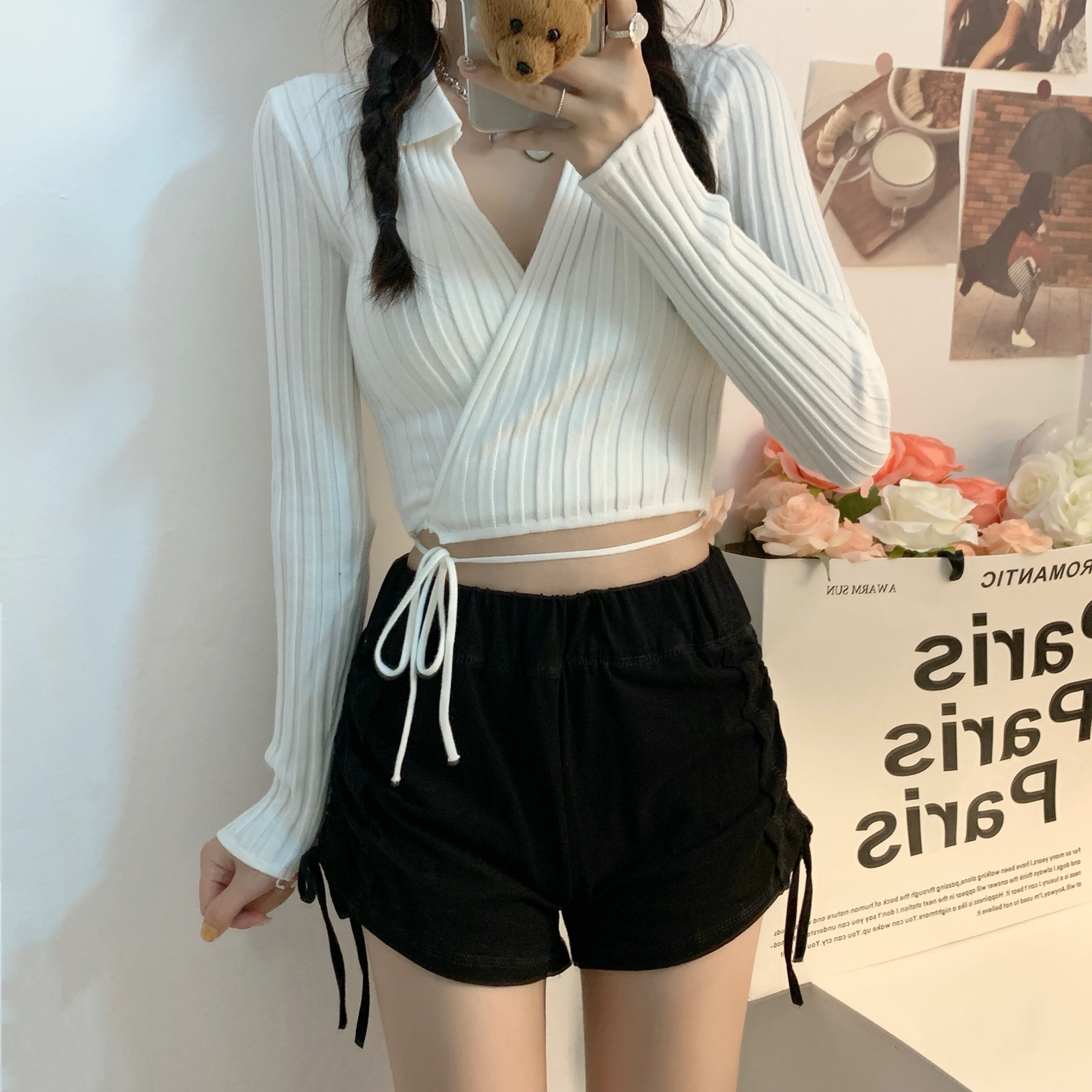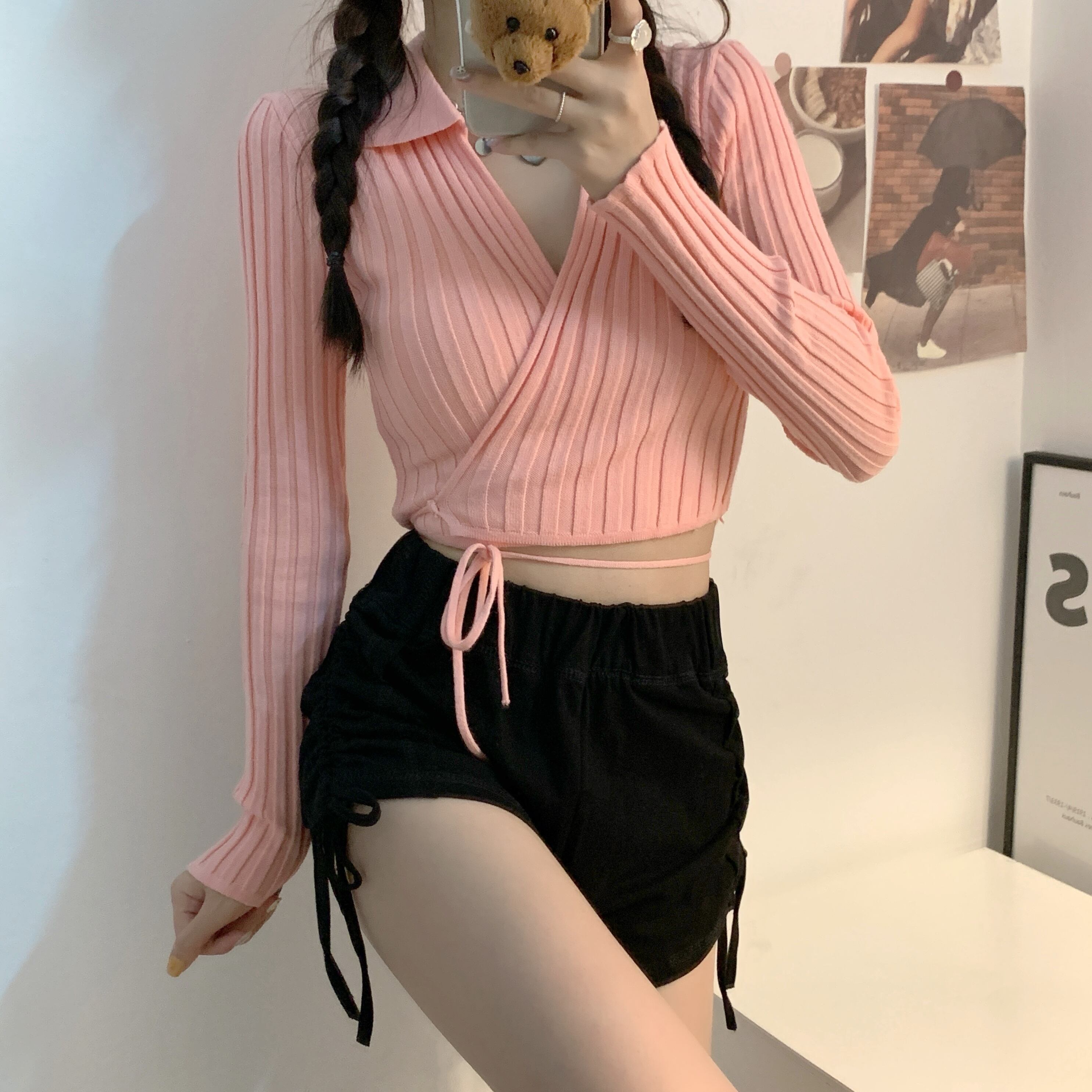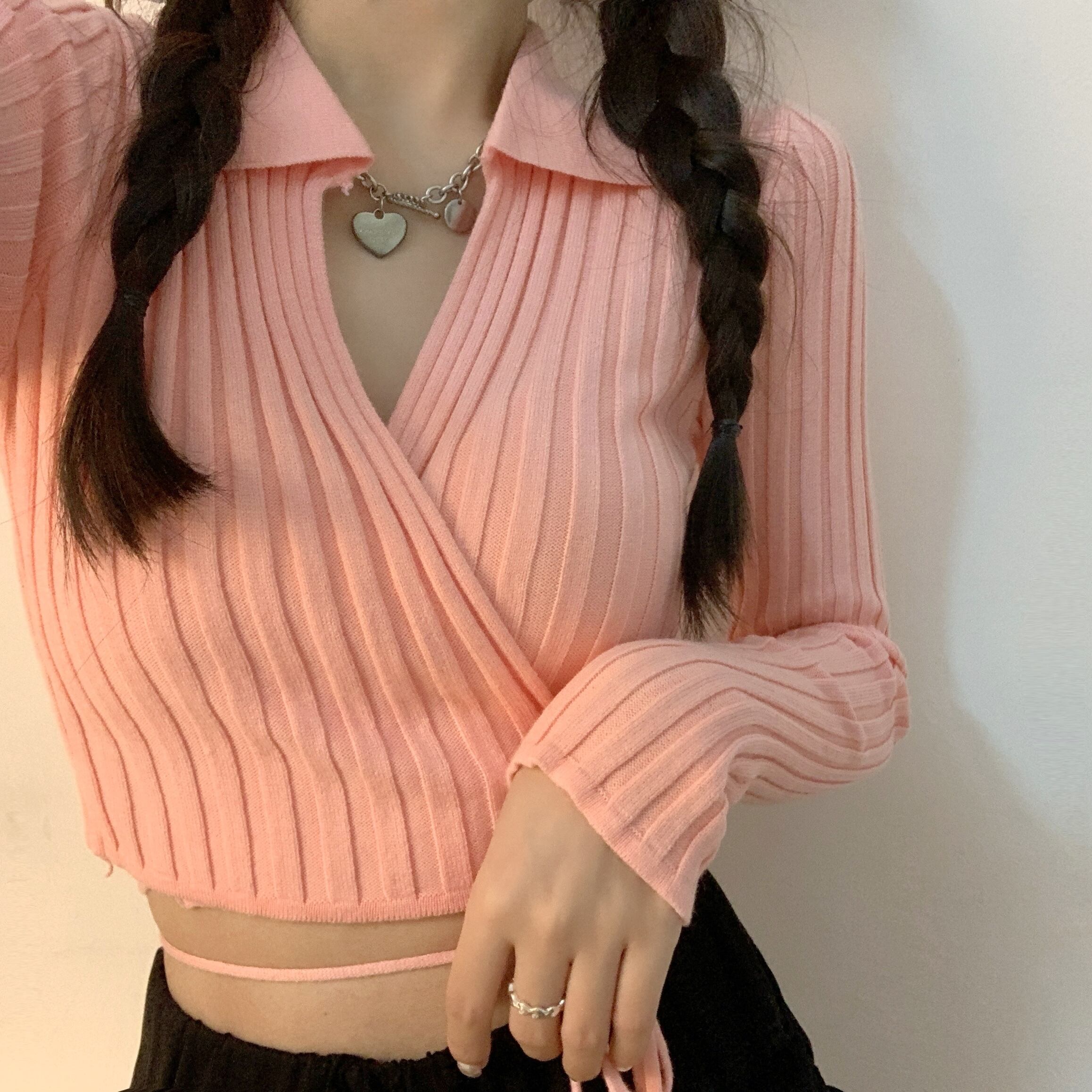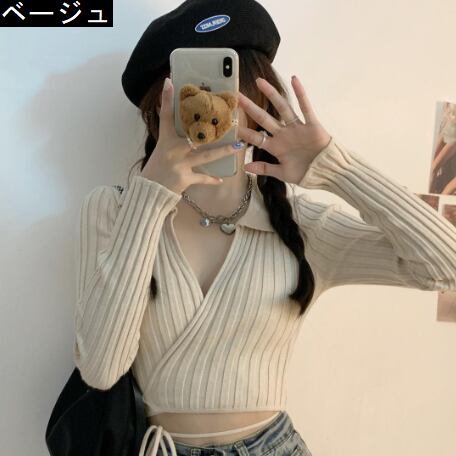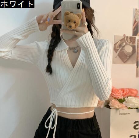 裾紐ベルト付き カシュクール デコルテ見せ カシュクール クロップド丈 へそ出し 細身さん向け トップス ニットソー セーター ショート丈 長袖 Vネック 襟付き スリム 細身 リブ 前開き ニット かわいい 大人可愛い シンプル カジュアル おしゃれ 大人女子 個性的 セクシー 抜け感 無地 春 夏 2021 レディース 女性用 女の子 お出かけ 休日 イベント 海 着回し 普段使い 重ね着 韓国系 オルチャン ファッション 脚長 肌見せ 小さいサイズ ホワイト ブラック ベージュ ピンク