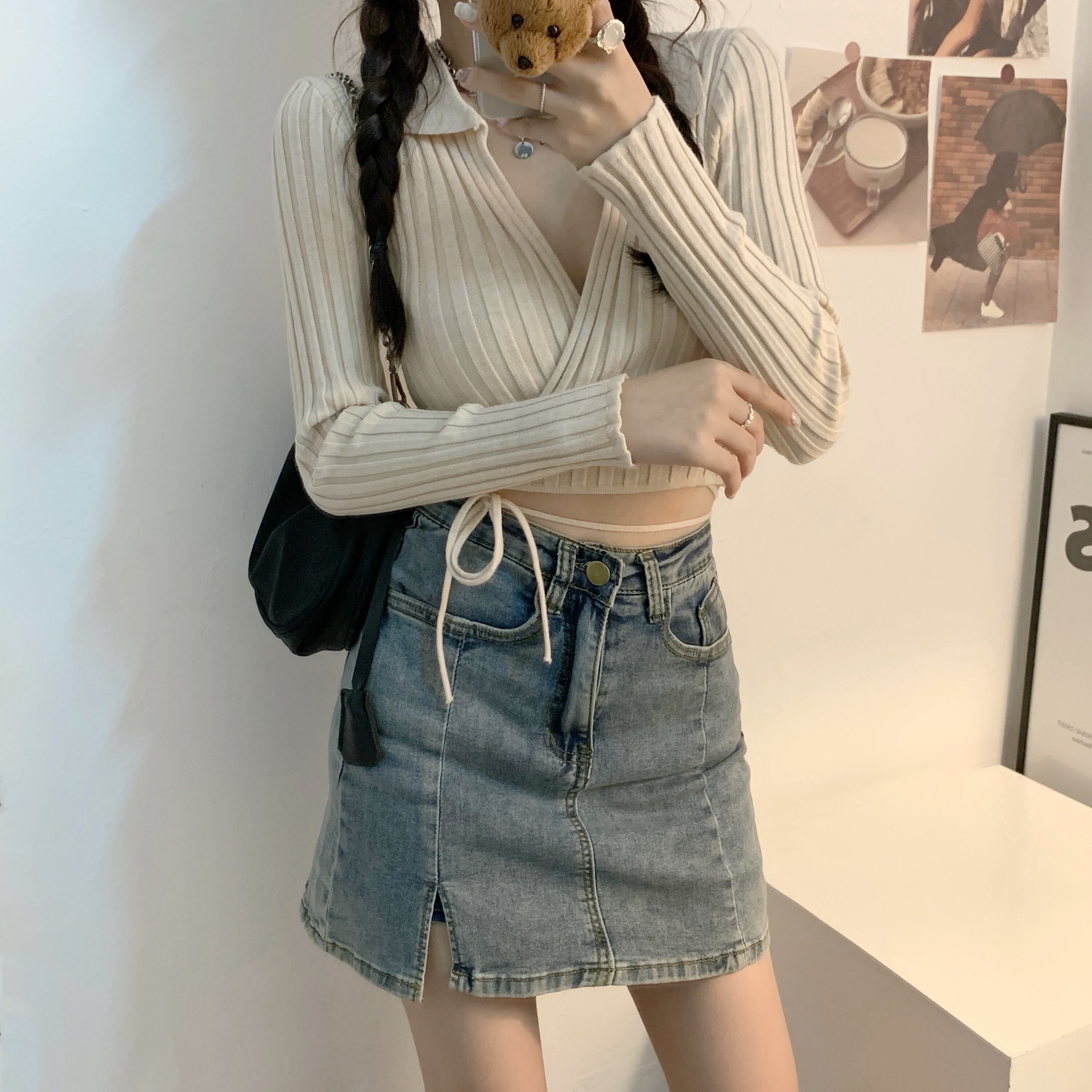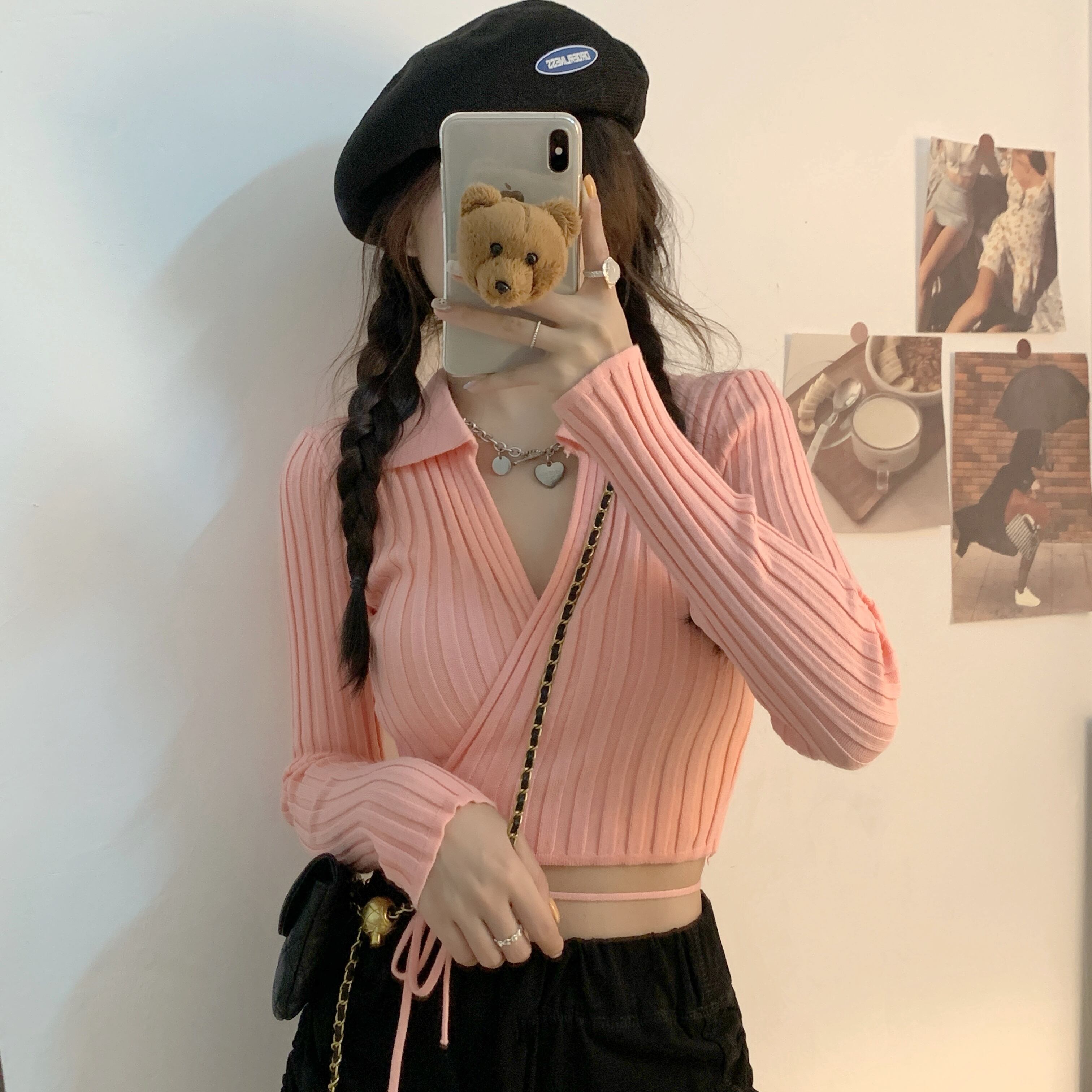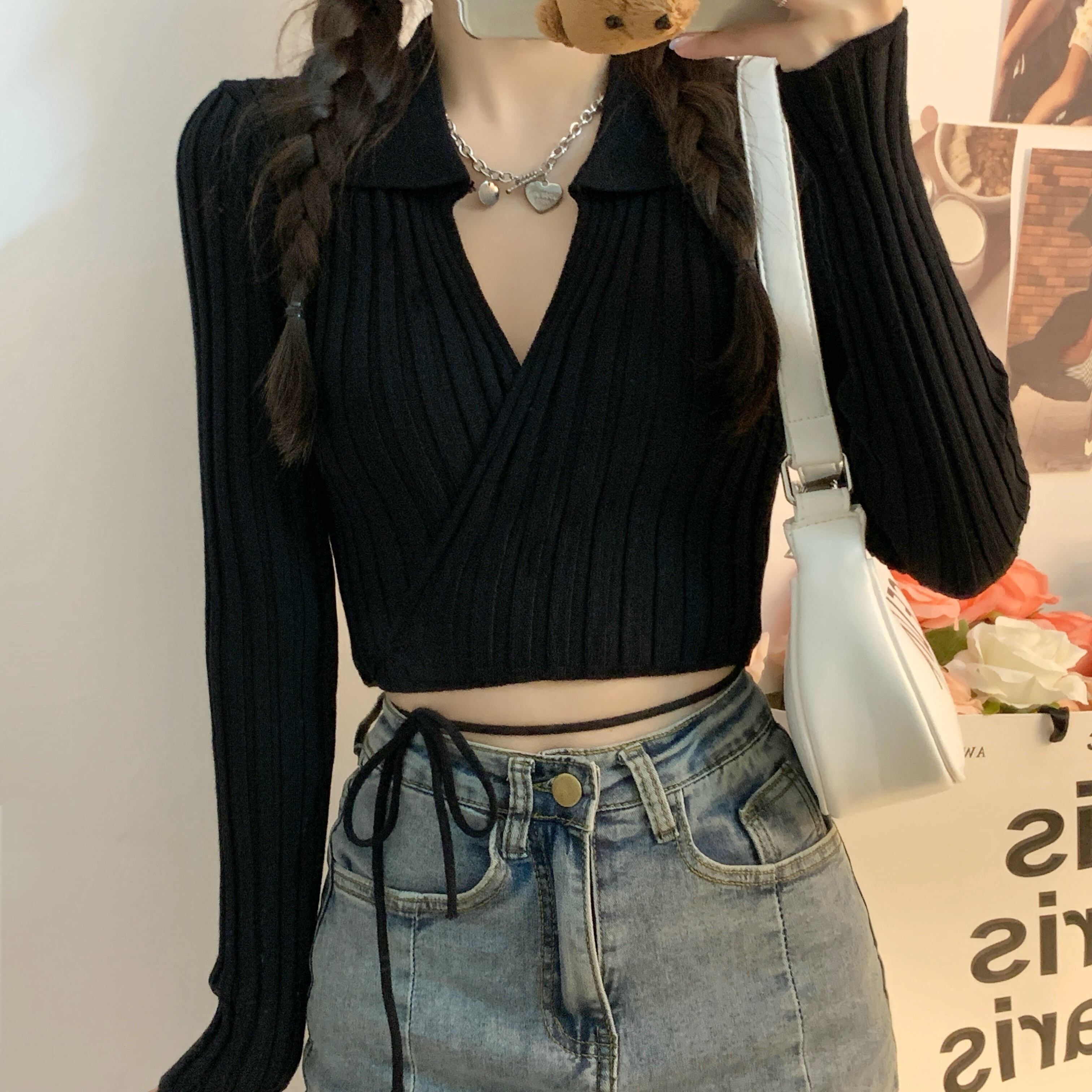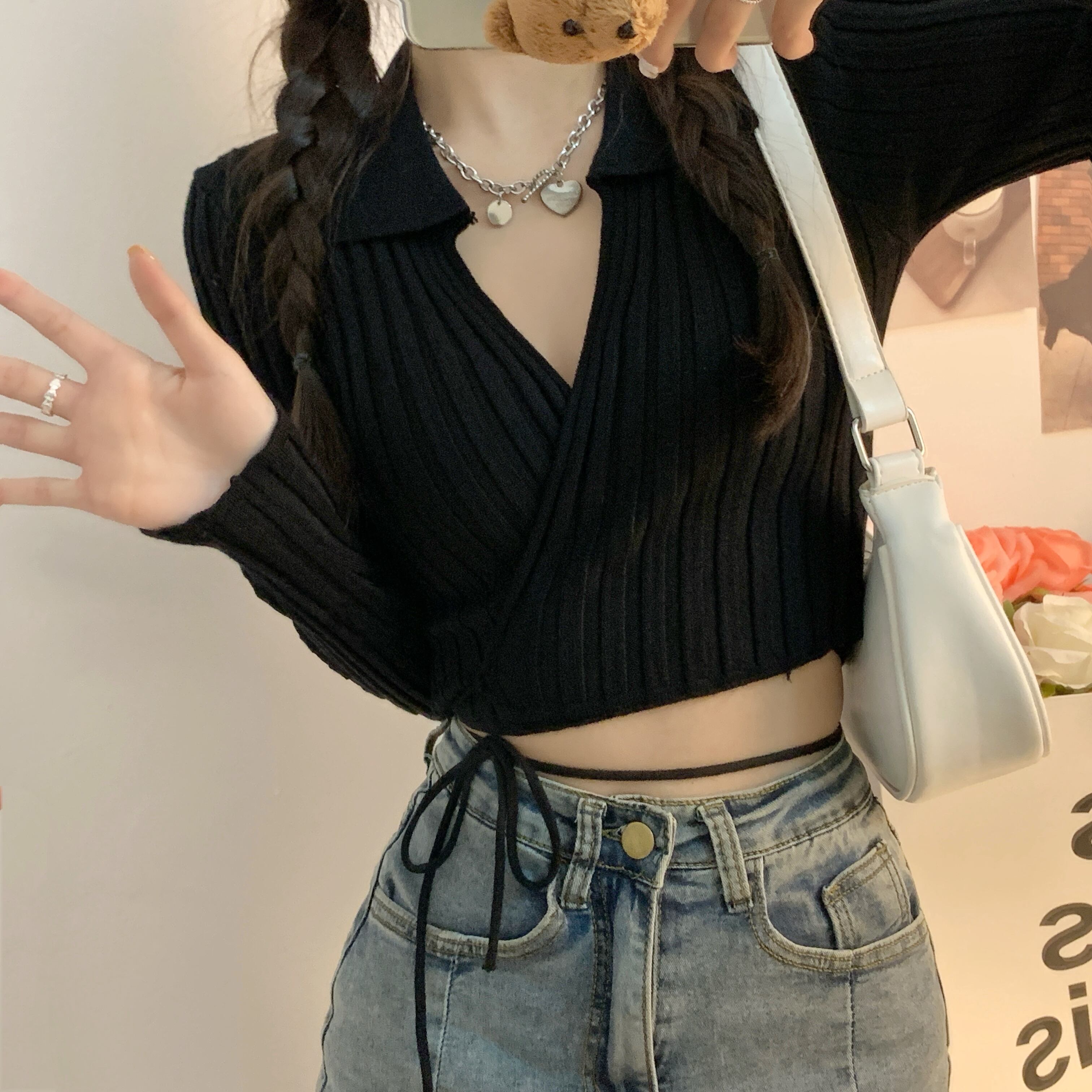 裾紐ベルト付き カシュクール デコルテ見せ カシュクール クロップド丈 へそ出し 細身さん向け トップス ニットソー セーター ショート丈 長袖 Vネック 襟付き スリム 細身 リブ 前開き ニット かわいい 大人可愛い シンプル カジュアル おしゃれ 大人女子 個性的 セクシー 抜け感 無地 春 夏 2021 レディース 女性用 女の子 お出かけ 休日 イベント 海 着回し 普段使い 重ね着 韓国系 オルチャン ファッション 脚長 肌見せ 小さいサイズ ホワイト ブラック ベージュ ピンク