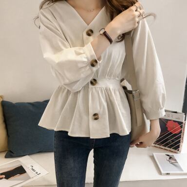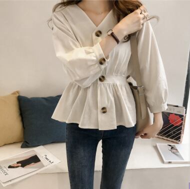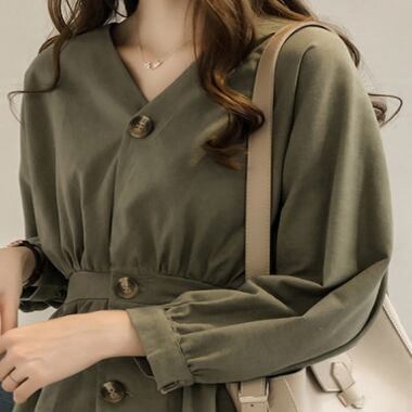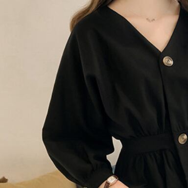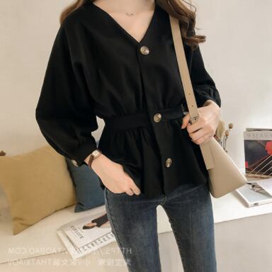 商品名:トップス シャツ 長袖 Vネック ウエストマーク ハイウエスト 前開き 2way