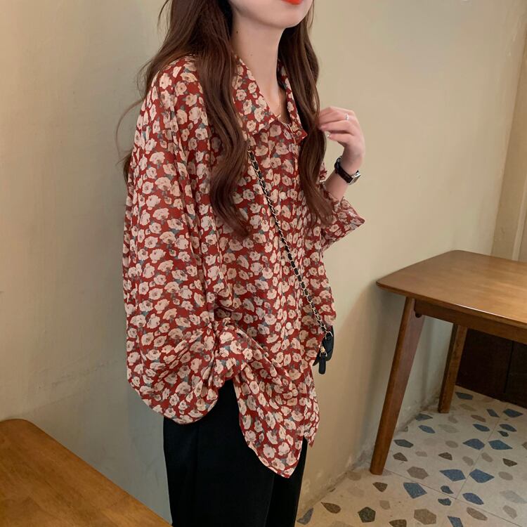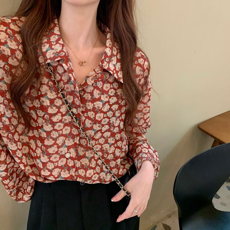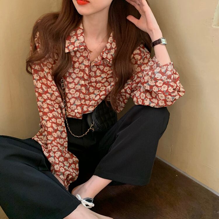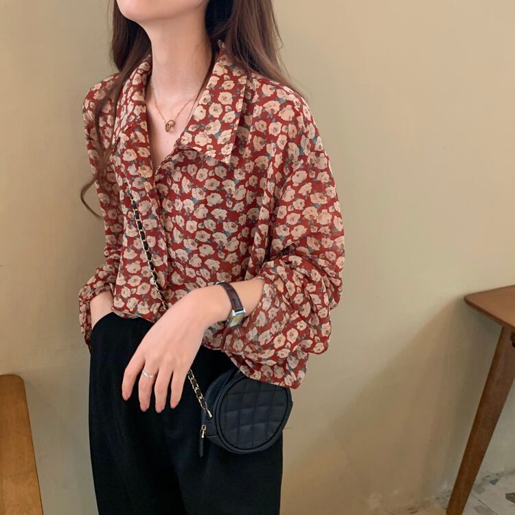 レトロ 花柄 シフォン ブラウス シャツ レッド 赤 フローラル フラワー ボタニカル トップス 袖あり 長袖 萌袖 Vネック 襟付き かわいい 大人可愛い きれいめ シンプル カジュアル 大人 上品 おしゃれ お洒落 大人女子 こなれ感 キュート ガーリー エレガント 主役級 存在感 春 秋 2021 レディース 女性用 学生 通学 デート 休日 お出かけ 女子会 イベント 旅行 着回し 普段使い 定番 韓国系 モテ トレンド 流行 インスタ映え おすすめ インポート S M L XL 2XL 3XL