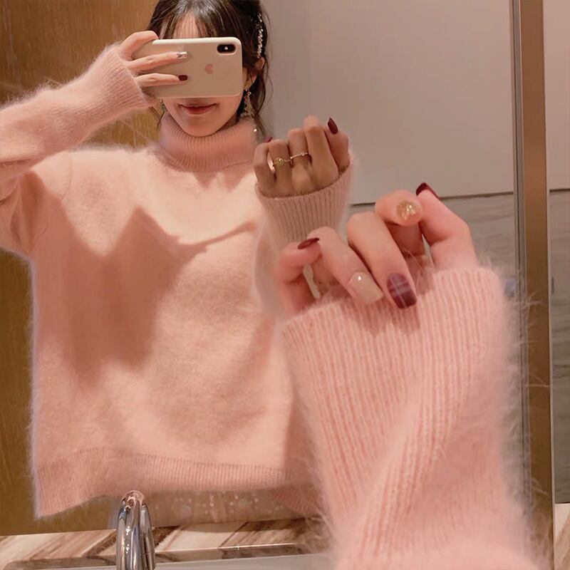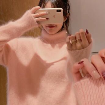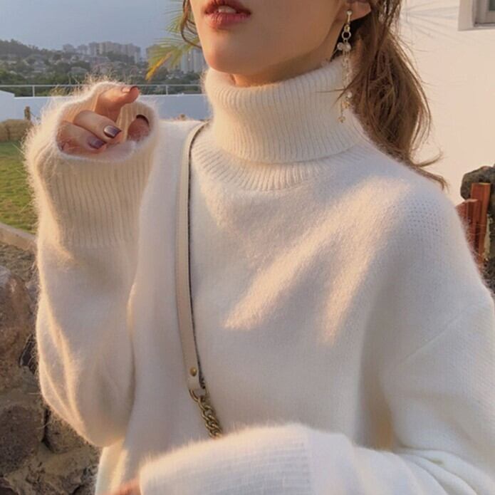 白・ピンク・イエローの無地カラーで、スマートかわいいシルエットのタートルネックセーター。