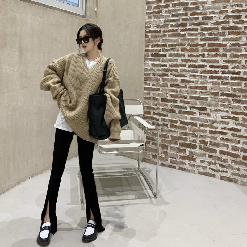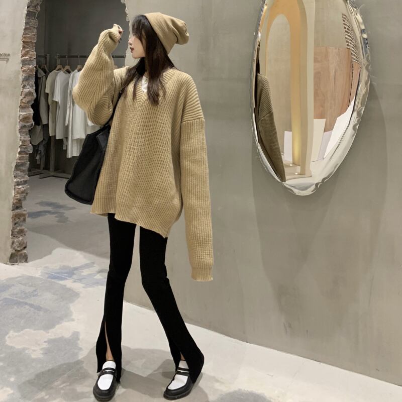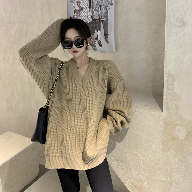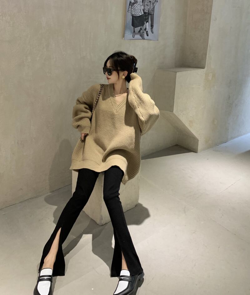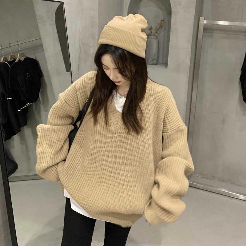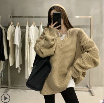 体が泳ぐぐらいのゆるーいシルエットが今っぽいざっくりローゲージ編みのVネックニット。