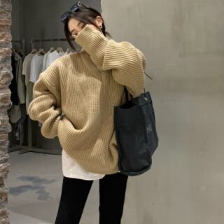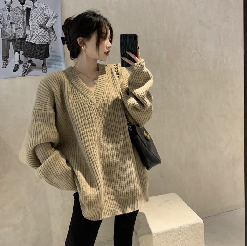 萌袖とドロップショルダーが可愛らしさとトレンド感を兼ね備え、それに加えてVネックが顔周りをすっきりと見せてくれます。ミディアム丈で重ね着にも最適なので、秋冬のおしゃれの幅を広げます。