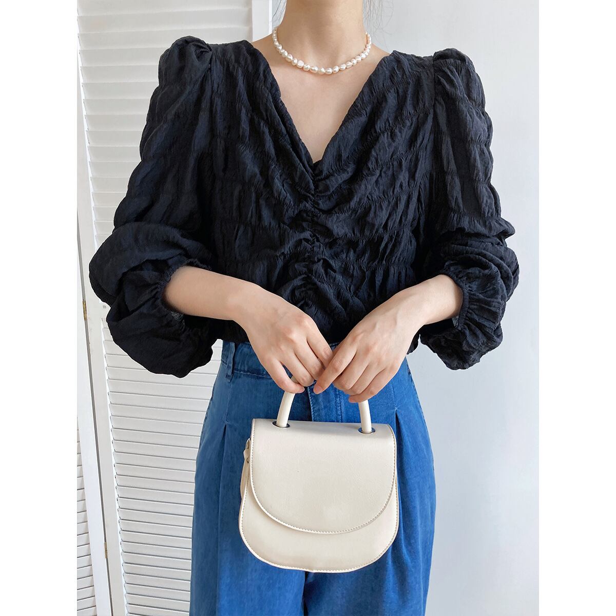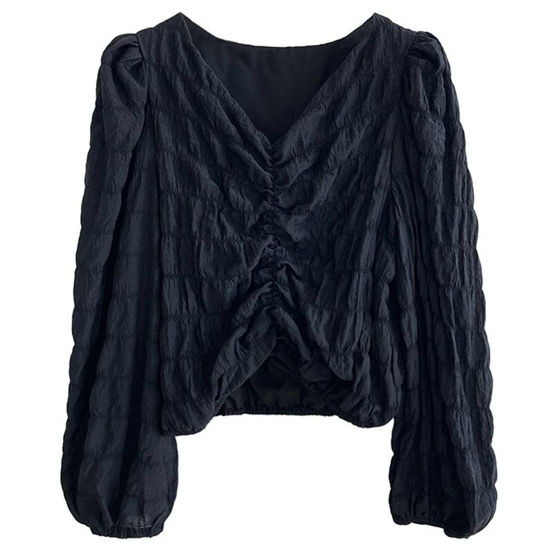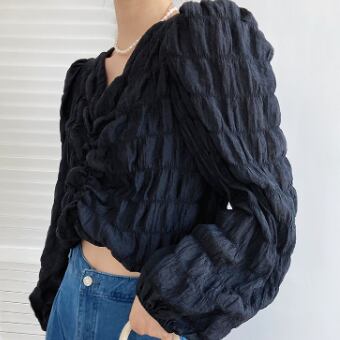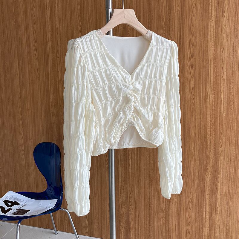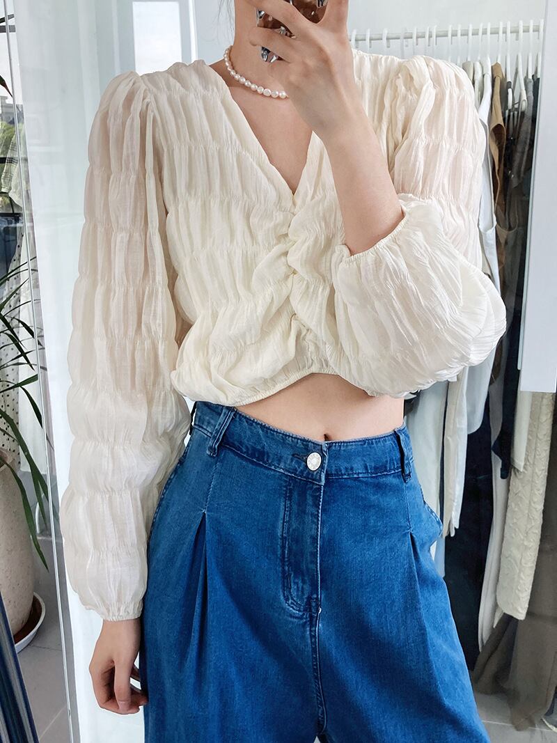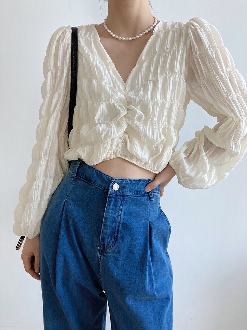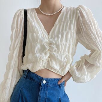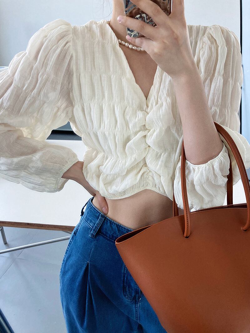 トップス ブラウス カットソー 白トップス ショート ショート丈 長袖 ボリューム袖 Vネック タイト 細身 スマート シフォン かわいい 大人可愛い きれいめ おしゃれ お洒落 大人可愛い 大人女子 ラブリー キュート ガーリー 個性的 セクシー エレガント 主役級 存在感 春 秋 10代 20代 30代 レディース 女性用 学生 デート お出かけ 女子会 休日 着回し 普段使い 韓国 韓国系 オルチャン ファッション コーデ スタイル 暖かい モテ 送料無料 トレンド 流行 インスタ映え インポート