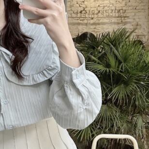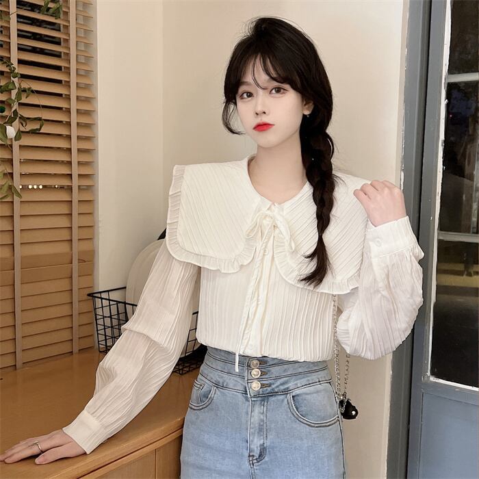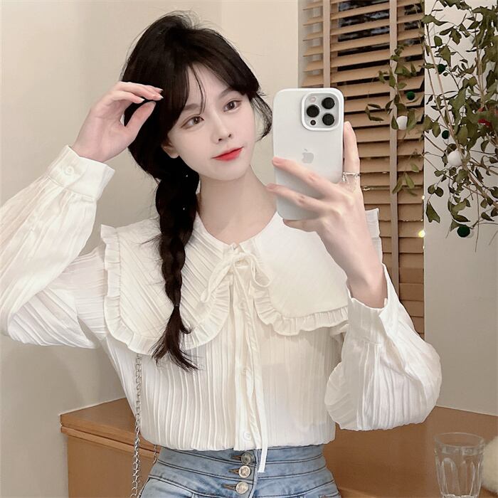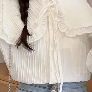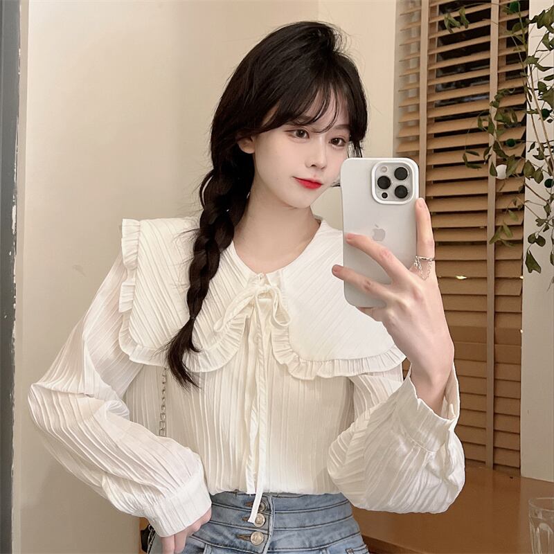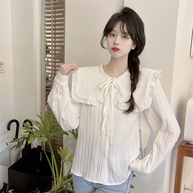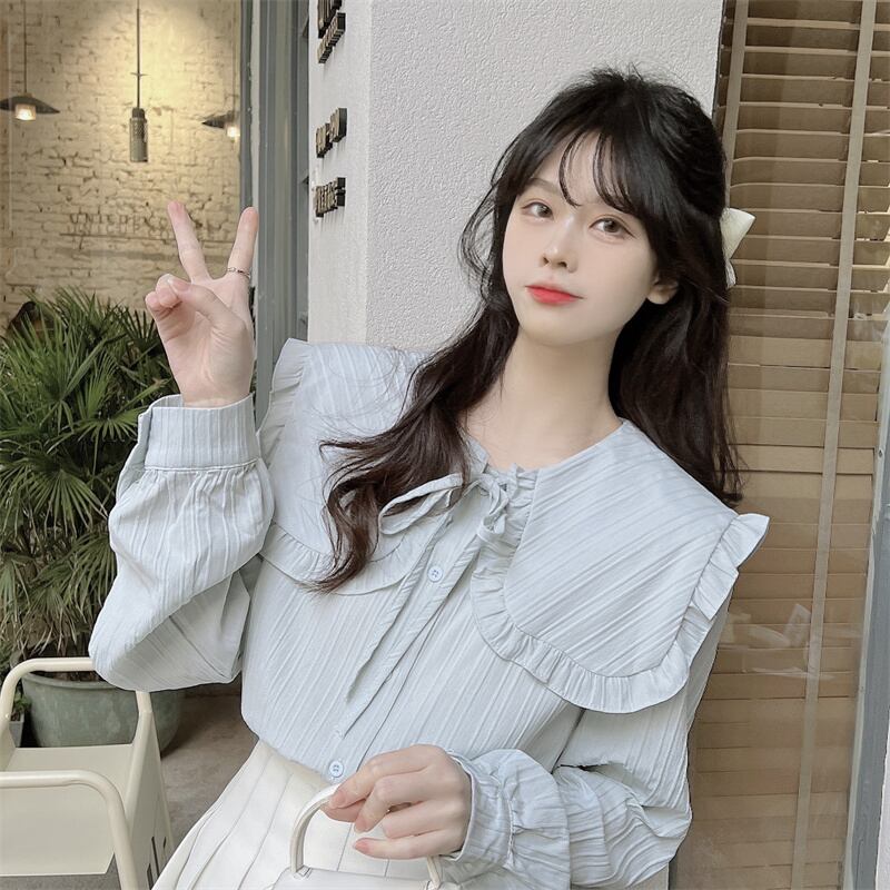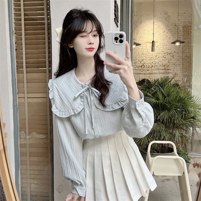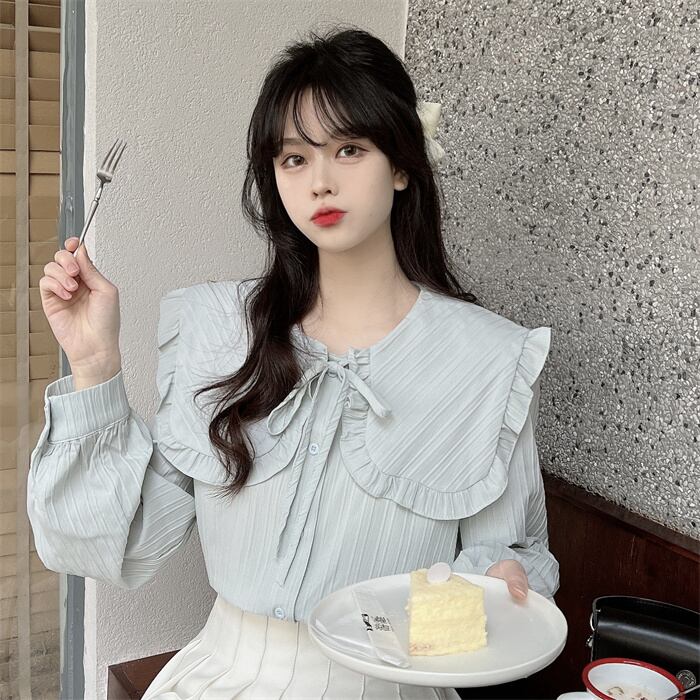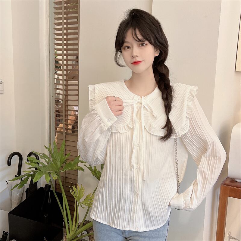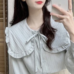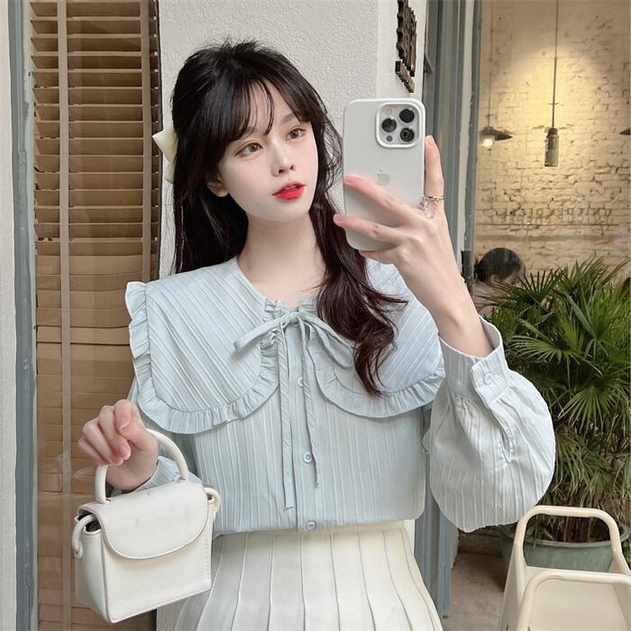 プリーツ風ライン 首元細リボン ビックカラー 大きめ襟 トップス ブラウス シャツ ミディアム丈 長袖 襟付き リボン かわいい 大人可愛い きれいめ シンプル カジュアル 上品 おしゃれ こなれ感 キュート ガーリー フェミニン 存在感 春 秋 冬 2021 レディース 女性用 女の子 学生 通学 デート お出かけ 女子会 休日 着回し 普段使い 重ね着 韓国系 オルチャン ファッション コーデ スタイル モテ 新作 トレンド 好感度 フリーサイズ ゆったり サイズ ホワイト ライトグリーン