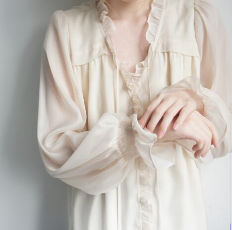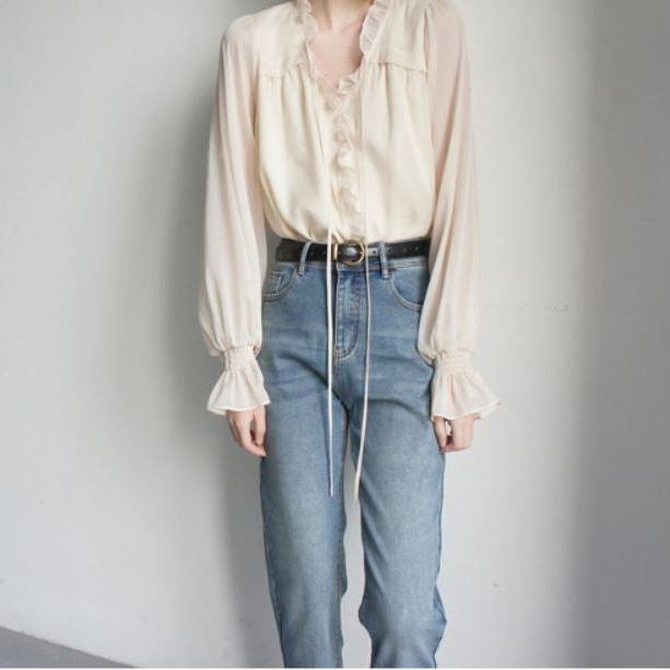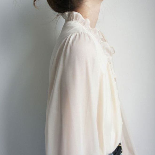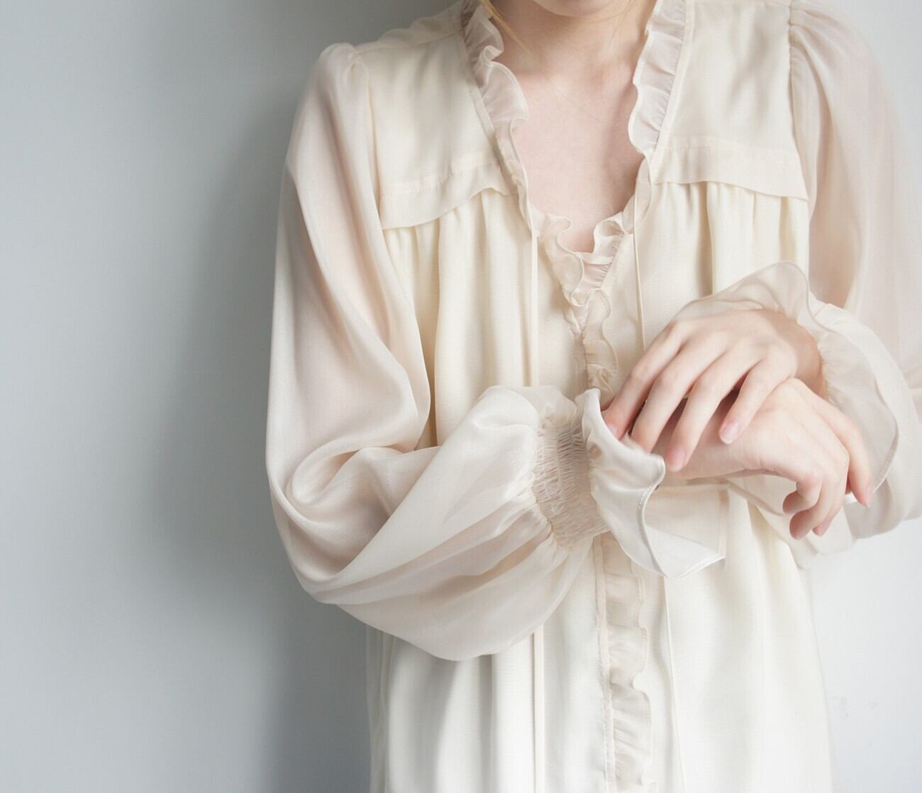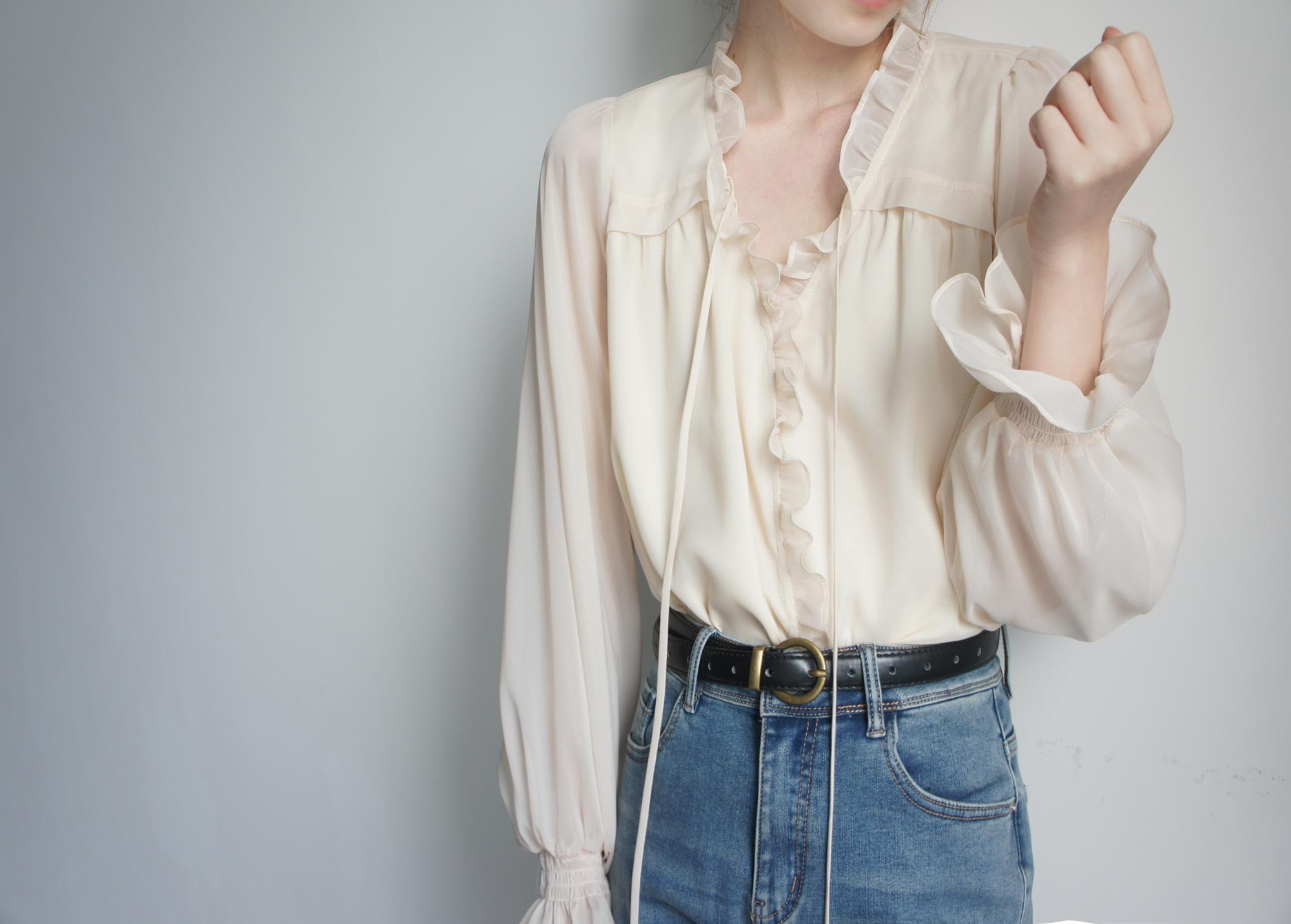 首周り~前立て部分にフリルをあしらった上品な印象のブラウス。