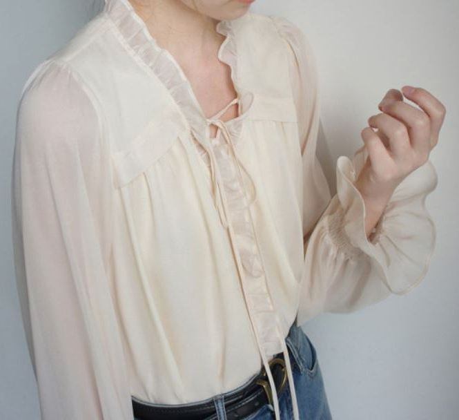 オーバーサイズ 首元リボン キャンディスリーブ トップス ブラウス ミディアム丈 袖あり 長袖 ボリューム袖 パフスリーブ Vネック 襟付き 透け感 ポリエステル 大人可愛い きれいめ シンプル カジュアル 上品 おしゃれ お洒落 こなれ感 ガーリー 無地 春 夏 秋 2021 レディース 女性用 ママ 女の子 OL 通勤 学生 通学 デート お出かけ 女子会 休日 着回し 普段使い 重ね着 韓国系 オルチャン コーデ 楽ちん 体系カバー S 大きめ ゆったり ゆる サイズ ホワイトアプリコット