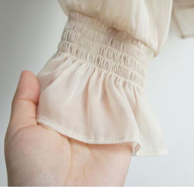 手首を絞ったキャンディスリーブのふんわり感が大人可愛く、首元のリボンはそのままラフに垂らしたり蝶結びしたりとアレンジが楽しめます。