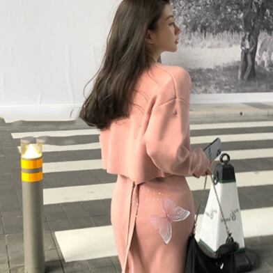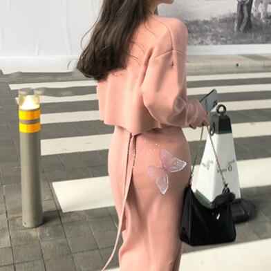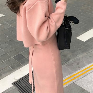このセットアップは、グレーとピンクのカラーリングが可愛らしい、トップス、スカート、カーディガンの3点セットです。細身のタイトなシルエットで、上品さと女性らしさを演出。大人女子にぴったりの、落ち着いた雰囲気が魅力です。