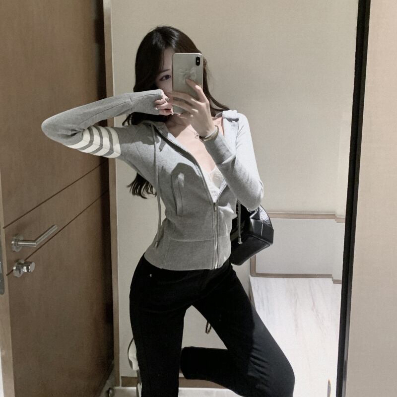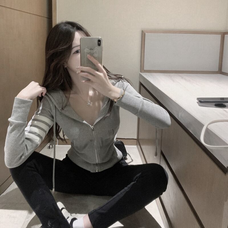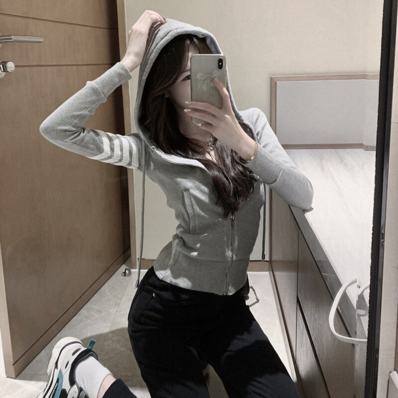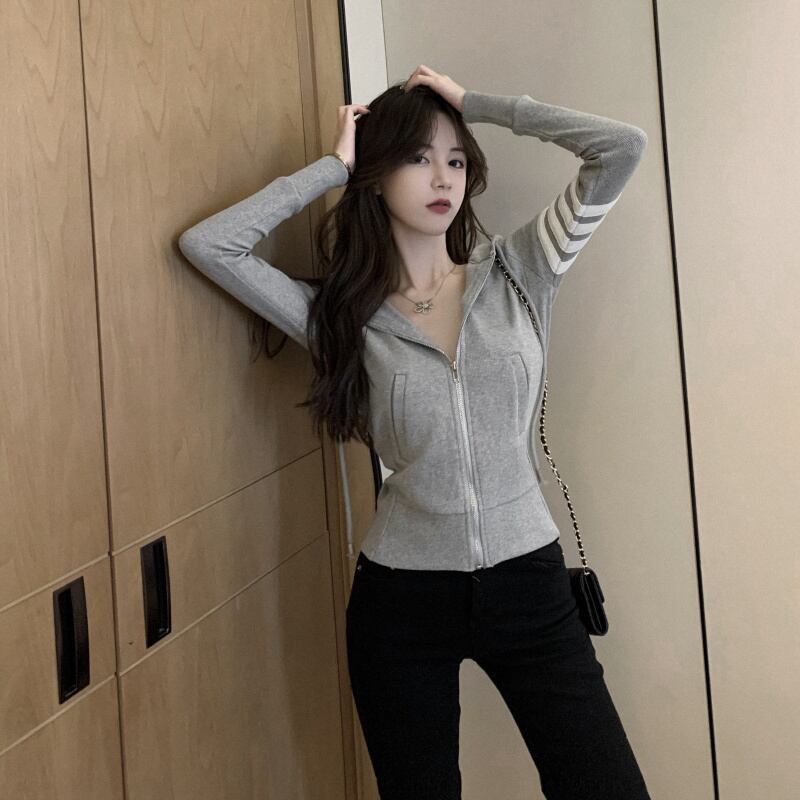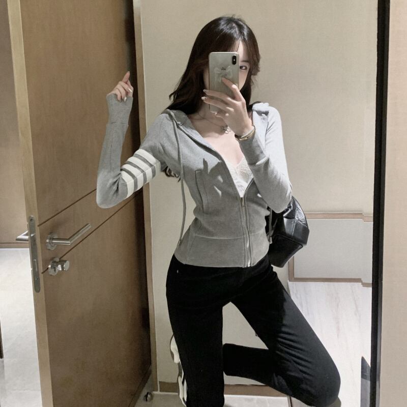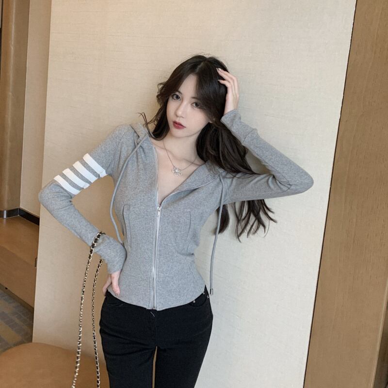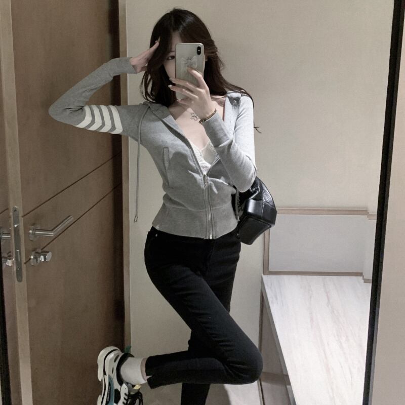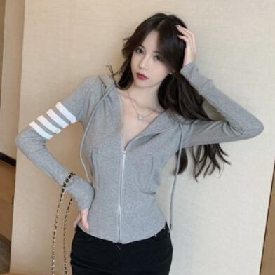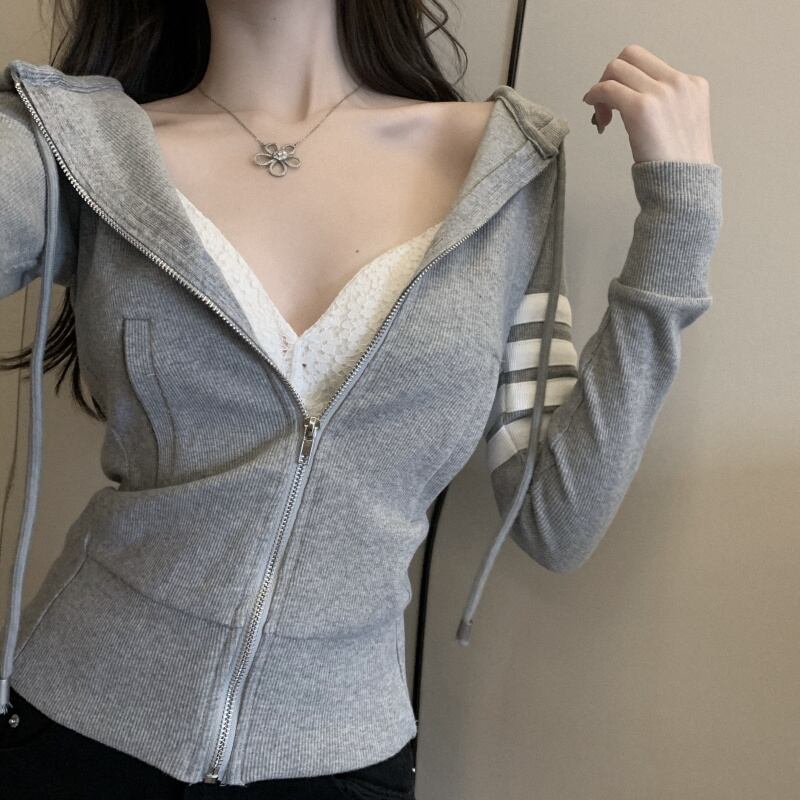 ニットパーカー トップス カーディガン フーディー スポーティ グレー 灰色 ショート丈 袖あり 長袖 フード スリム タイト 細身 ファスナー ジッパー 大人女子 大人 上品 おしゃれ かっこいい クール カジュアル レトロ レトロ風 こなれ感 ラフ 個性的 デザイン 主役級 存在感 柄 ライン 春 スプリング 秋 オータム 10代 20代 レディース 女性用 学生 通学 運動 アウトドア 動きやすい 休日 おうち 着回し 普段使い 重ね着 ファッション コーデ S M