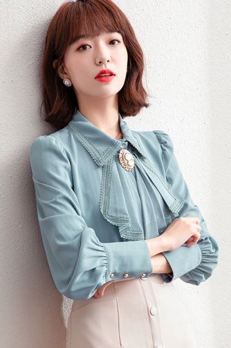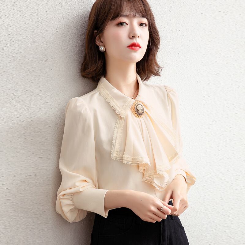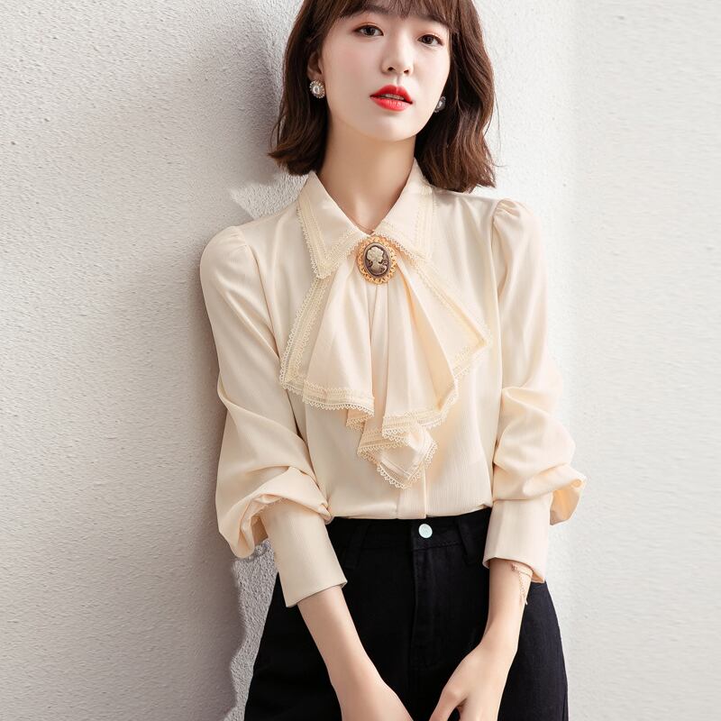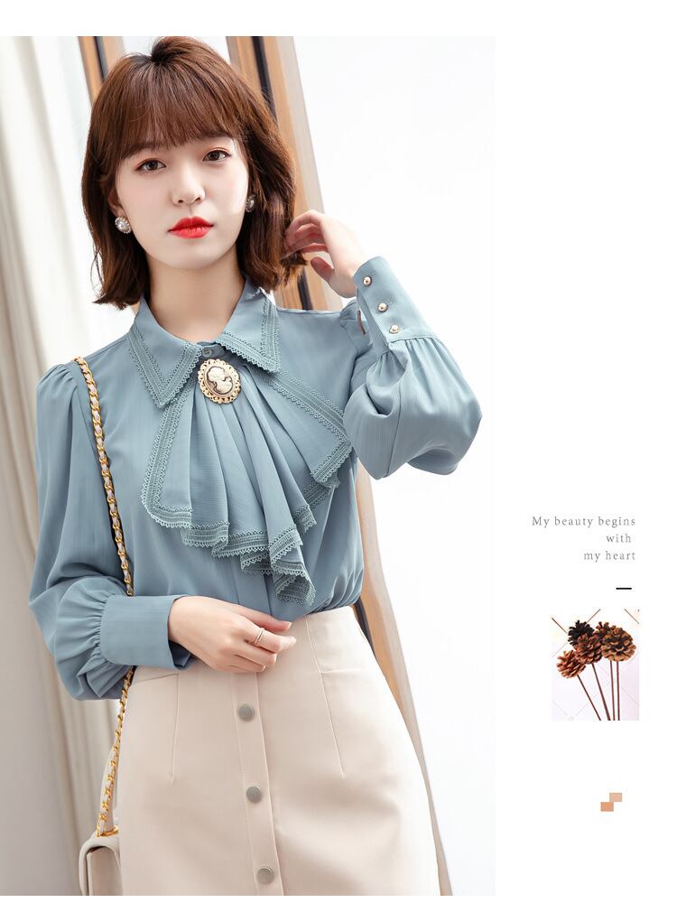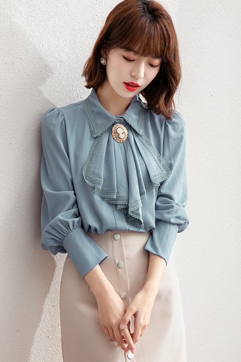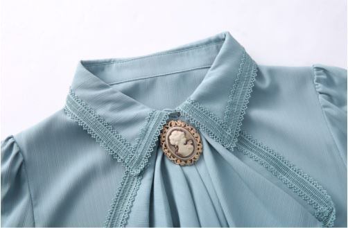 胸元の大きなブローチとレースタイがエレガントなドールカラーブラウスです。