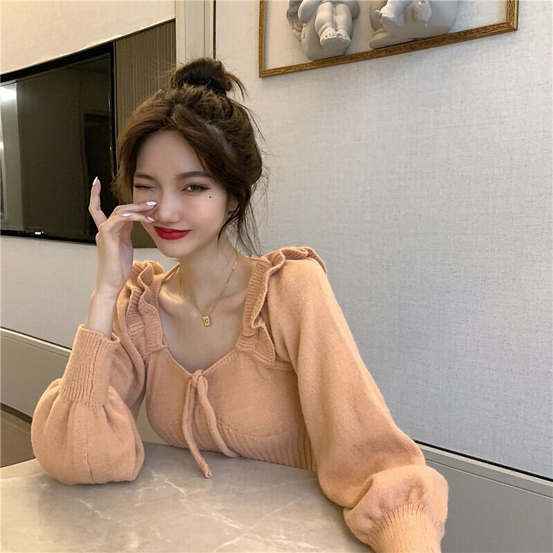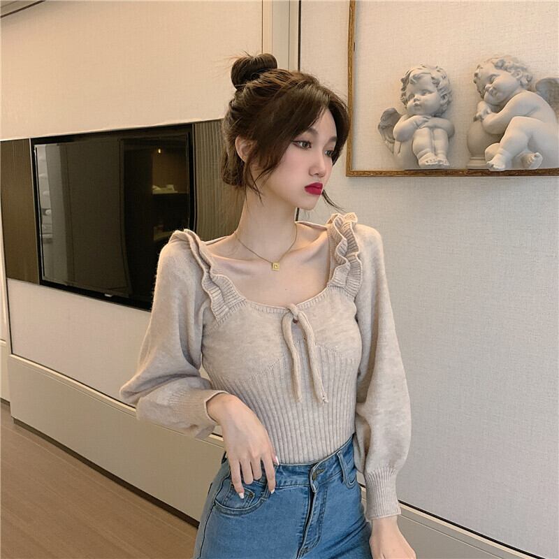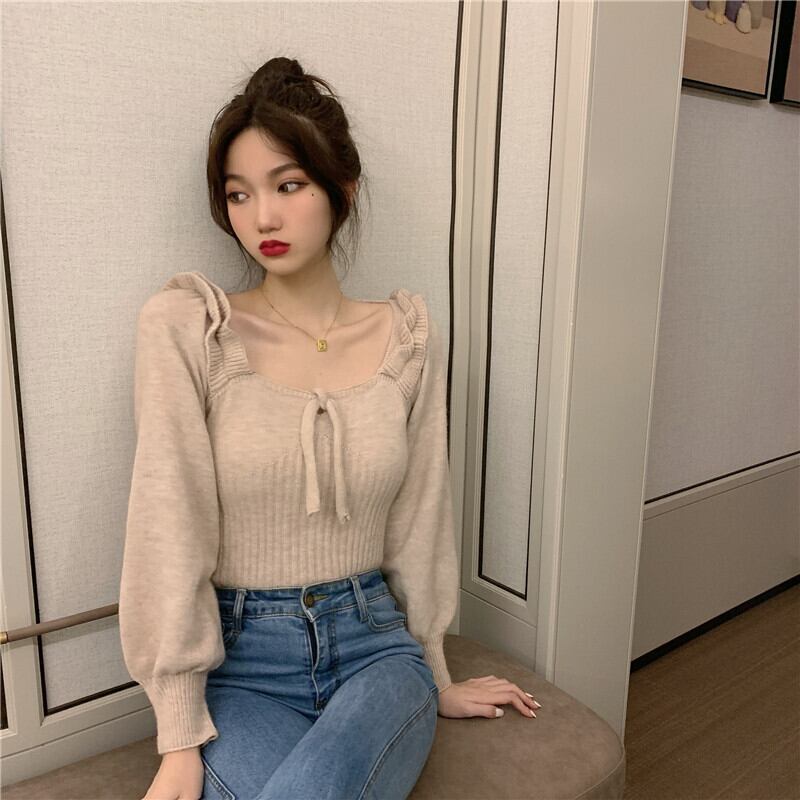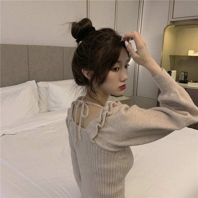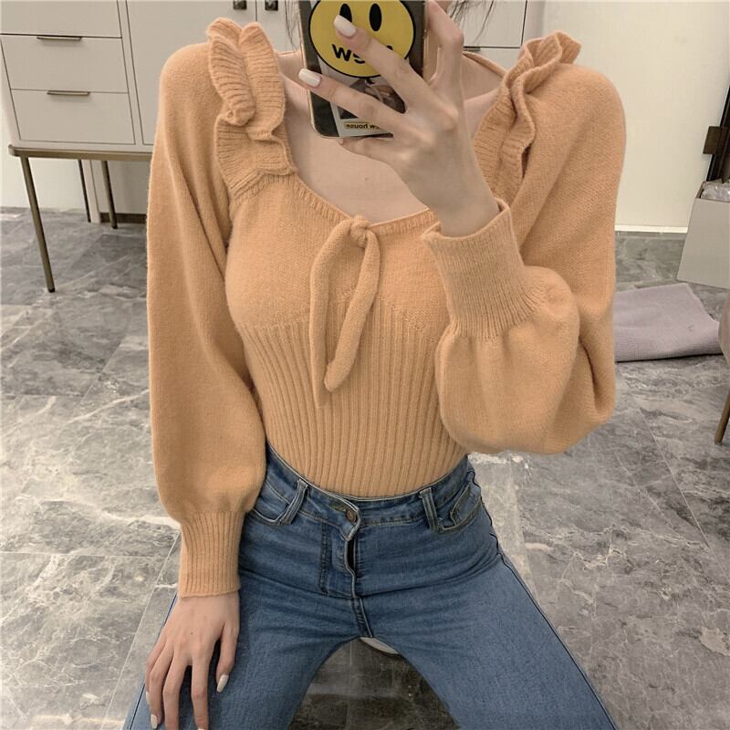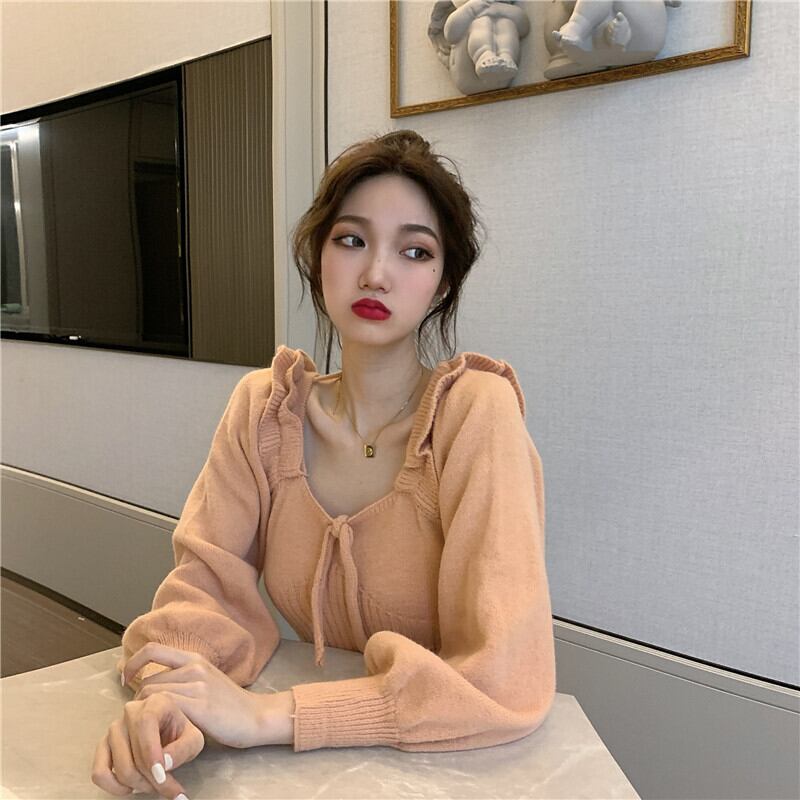 肩フリル風 立体装飾 細めさん向け デコルテ見せ バックネックリボン結び クロップド トップス ニットソー セーター ショート丈 長袖 スクエアネック スリム タイト 細身 伸縮性 ポリエステル ニット かわいい 大人可愛い きれいめ シンプル カジュアル 上品 おしゃれ キュート ガーリー 無地 春 秋 冬 2021 レディース 女性用 学生 通学 デート お出かけ 女子会 休日 着回し 普段使い 韓国系 オルチャン ファッション コーデ スタイル モテ 脚長 トレンド ベージュ オレンジ