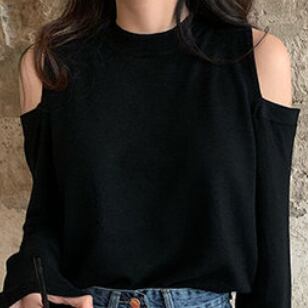 肩先をカットしたようなオープンショルダーデザインで、ほんのりセクシーに肌見せ我楽しめるニットソー。
