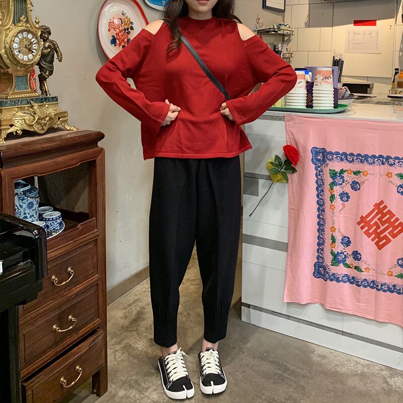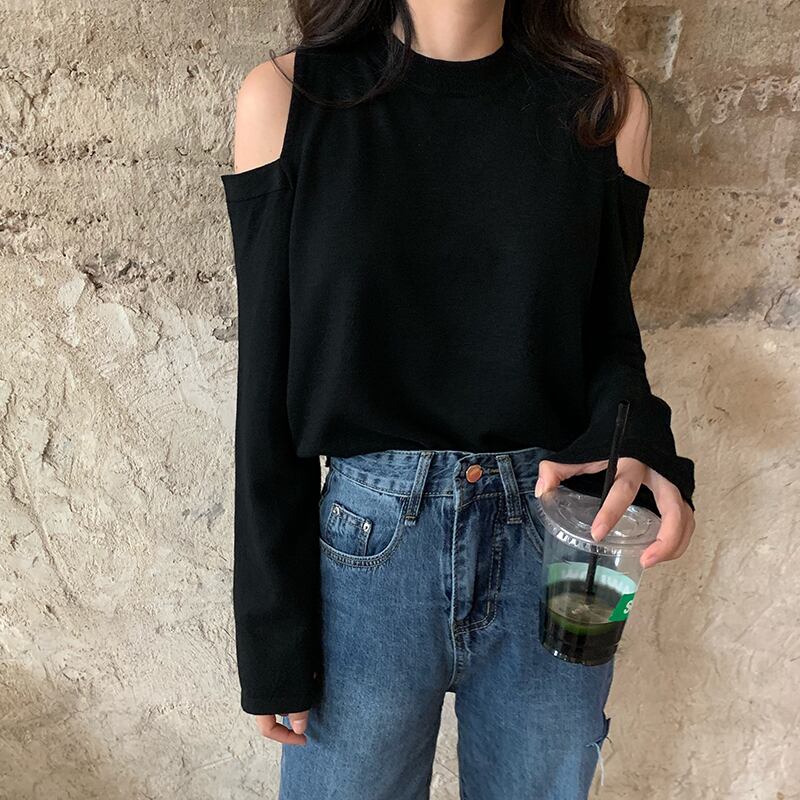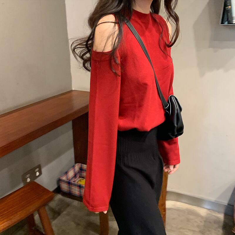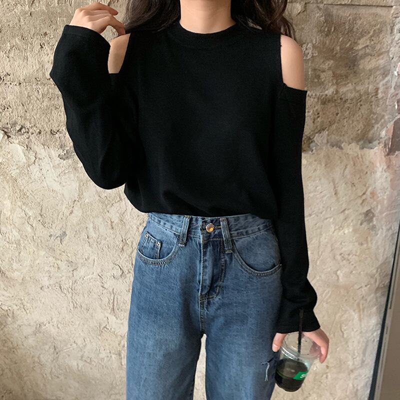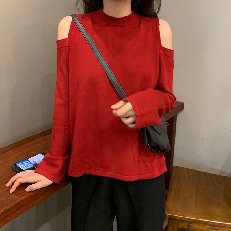 オープンショルダー 肩出し 肌見せ トップス ニットソー セーター ミディアム丈 長袖 クルーネック ニット きれいめ シンプル カジュアル おしゃれ お洒落 かっこいい 大人女子 こなれ感 クール セクシー 抜け感 無地 春 秋 冬 2021 レディース 女性用 学生 通学 デート お出かけ 女子会 休日 着回し 普段使い 重ね着 韓国系 オルチャン ファッション コーデ 楽ちん モテ 脚長 新作 S M L ゆったり サイズ ブラック レッド ブルー ベージュ マスタードグリーン カラバリ