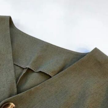 シンプルながら、細かなデザインにもこだわりました。ボタンを完全に閉じても、Vネックが見えるデザインは女性らしさを引き立て、大人っぽい上品な印象を与えます。個性的にも使いやすい、主役級な存在感のある一枚と言えます。