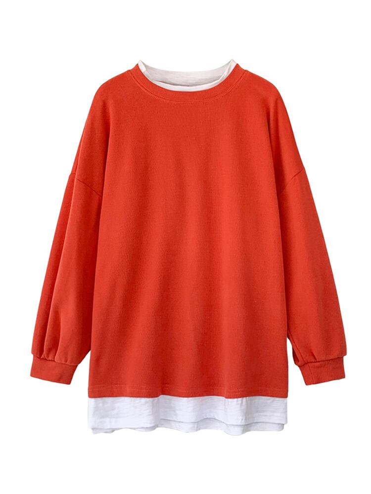 フェイクレイヤード トップス Tシャツ プルオーバー シンプル ブラック 黒 グリーン 緑 オレンジ ミディアム丈 袖あり 長袖 ラウンドネック ワイド フェイク2ピース 大人女子 大人 上品 おしゃれ カジュアル こなれ感 ラフ ルーズ シルエット 個性的 デザイン 主役級 存在感 無地 春 スプリング 30代 40代 50代 レディース 女性用 運動 アウトドア 動きやすい 休日 おうち 着回し 普段使い 重ね着 3XL 4XL 大きいサイズ M L XL 2XL