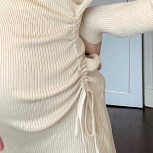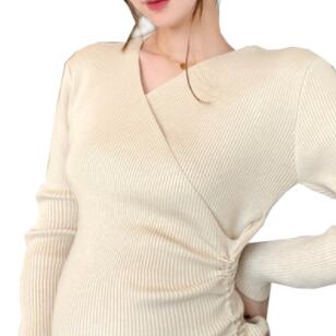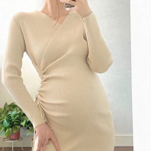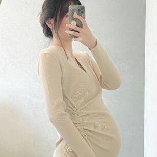 キュートで大人可愛いマタニティドレスです。Vネックとタイトなシルエットが女性らしさを引き立てます。長袖で秋冬でも着用可能で、ミニ丈が脚をすっきりと見せてくれます。色々なシーンで着回しできるオールマイティな一着です。