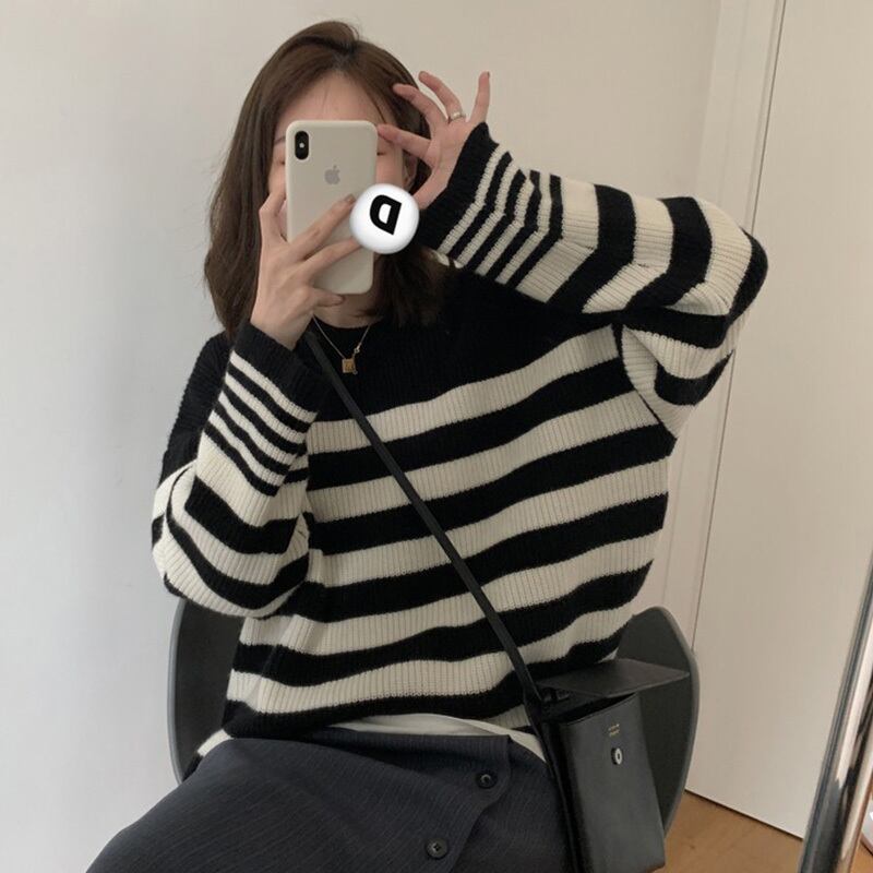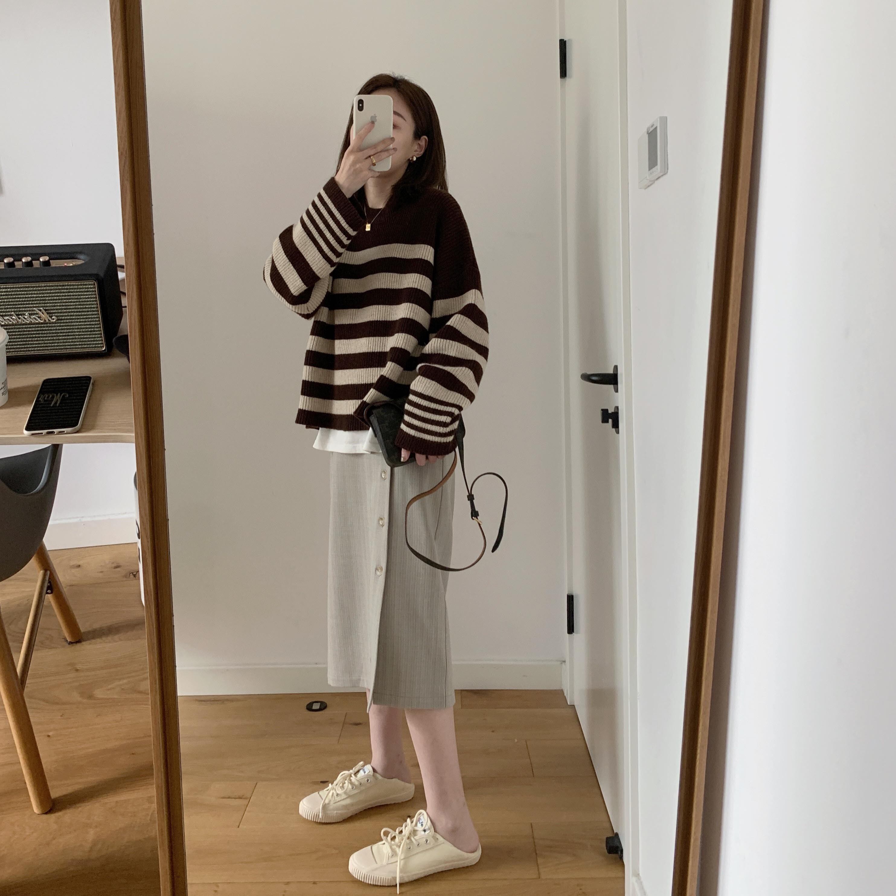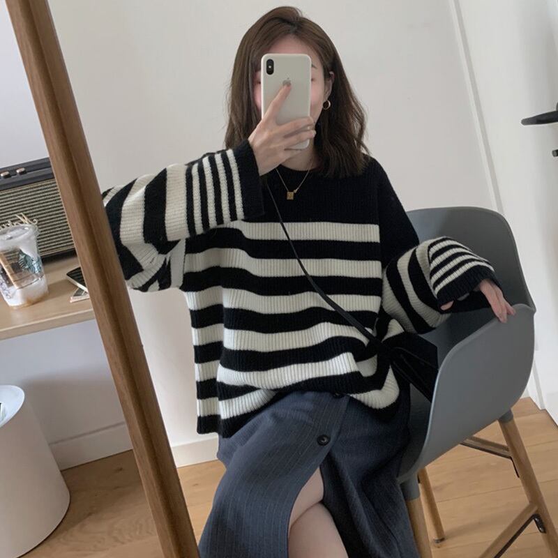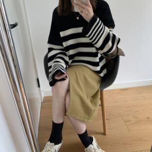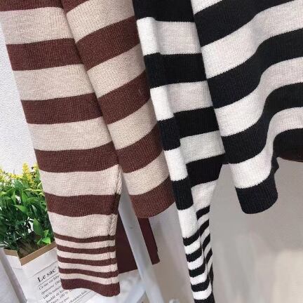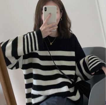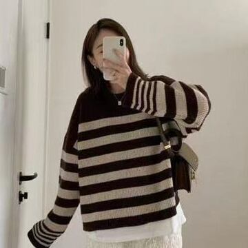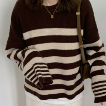 セーター ニット トップス プルオーバー ブラック 黒 ブラウン 茶色 レギュラー丈 袖あり 長袖 ラウンドネック ストレート 大人女子 大人 上品 おしゃれ カジュアル レトロ レトロ風 こなれ感 ラフ ルーズ シルエット 主役級 存在感 柄 コントラストカラー ストライプ 縞模様 ボーダー 秋 冬 10代 20代 30代 40代 レディース 女性用 学生 通学 休日 おうち 着回し 普段使い トレンド 暖かい 防寒 S M L XL バイカラー ツートーンカラー