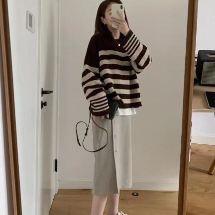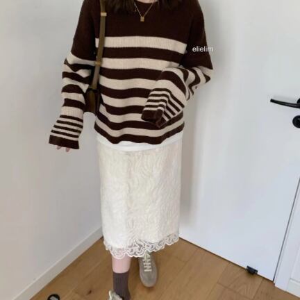 黒とブラウンのバイカラーニットが大人女子のおしゃれ度を上げます。レギュラー丈のストレートシルエットで、カジュアルからレトロ風まで幅広いスタイリングに合わせやすいのが魅力。コントラストカラーのストライプ柄が主役級の存在感を放ちます。