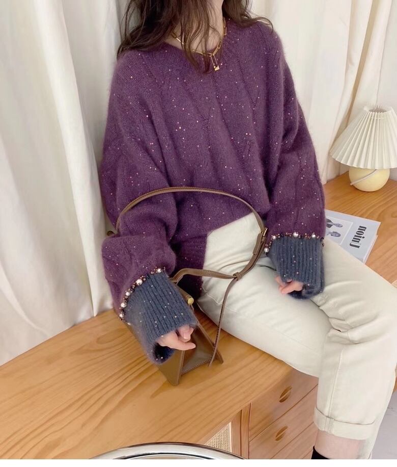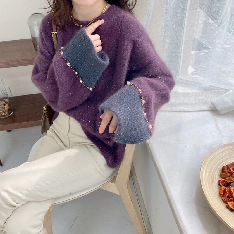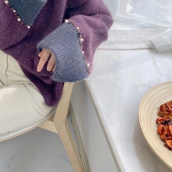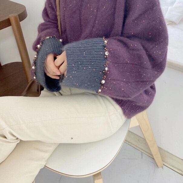 スパンコールセーターのグレー&パープルカラー。シンプルな無地デザインに、スパンコールがアクセントになった、上品でおしゃれな一着です。スリムで細身のストレートシルエットが、スマートな印象を与えてくれます。大人の女性にぴったりの、こなれ感あふれるラフクールなスタイルにも、エレガントでセクシーな大人可愛いコーディネートにも、幅広く使えるのが嬉しいところ。春、秋、冬に活躍するアイテムとして、イベントやパーティー、リゾートまで、様々な場面で活躍してくれます。韓国系オルチャンファッションや、通学やデートなどの普段使いにもおすすめです。女性的で可愛らしさも残した、大人女子なら誰でも憧れる、ワードローブ必須アイテムです。
