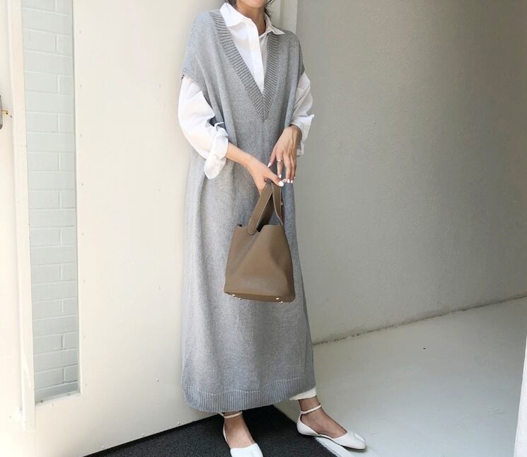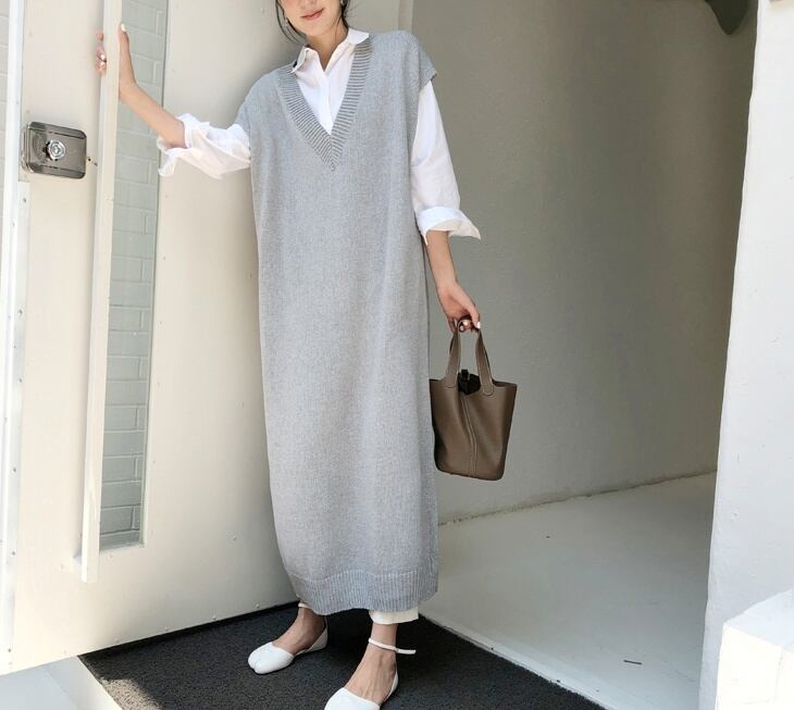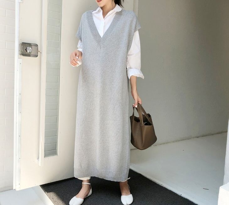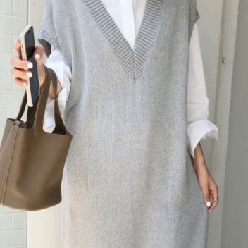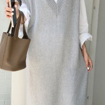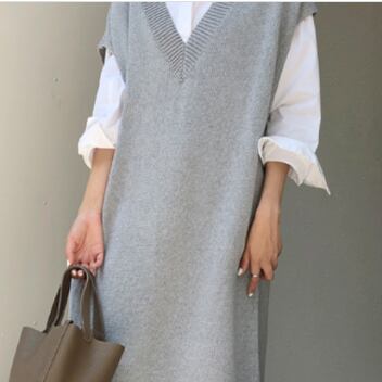 当店のニットワンピースは、Vネックで女性らしさをアピールできる大人可愛いアイテムです。ロング丈で体型カバーもばっちり!袖がないからシーズンレスで活躍できるのも嬉しいポイント。あなたに合うスタイリングで、マニッシュにもキュートにも着こなせ、主役級の存在感を発揮します。