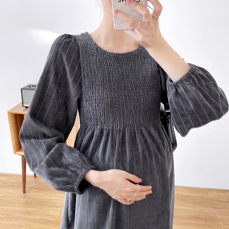 胸元のギャザーデザインが可愛いマタニティワンピースです。