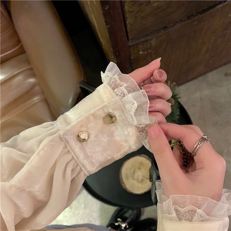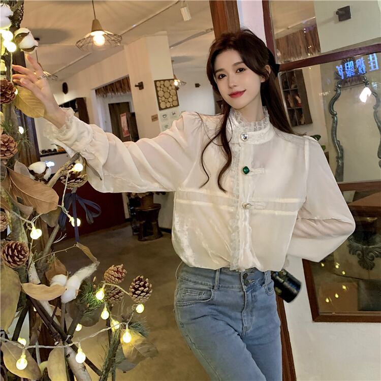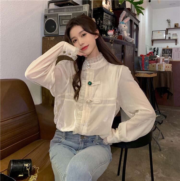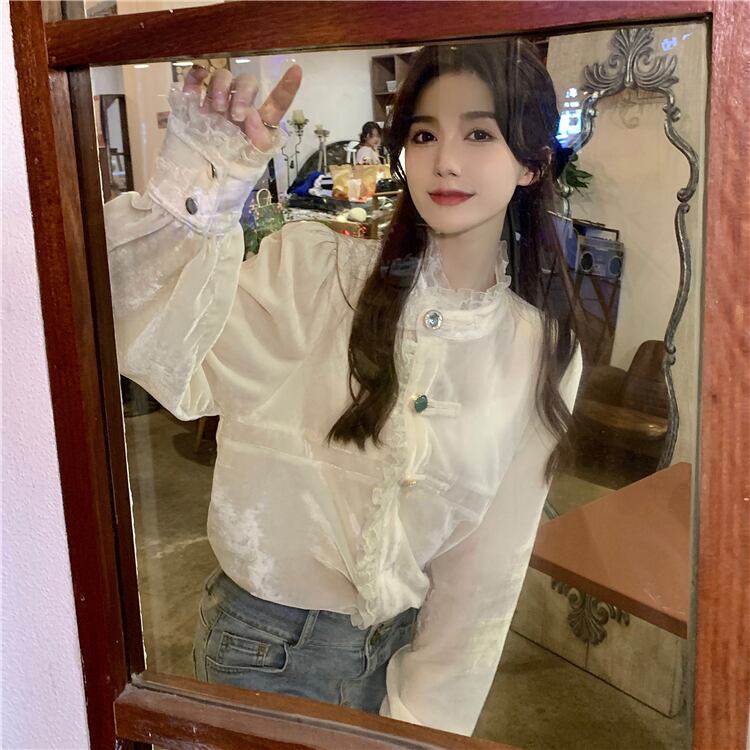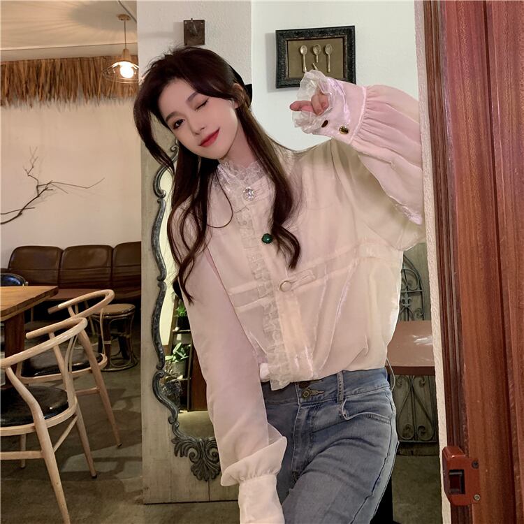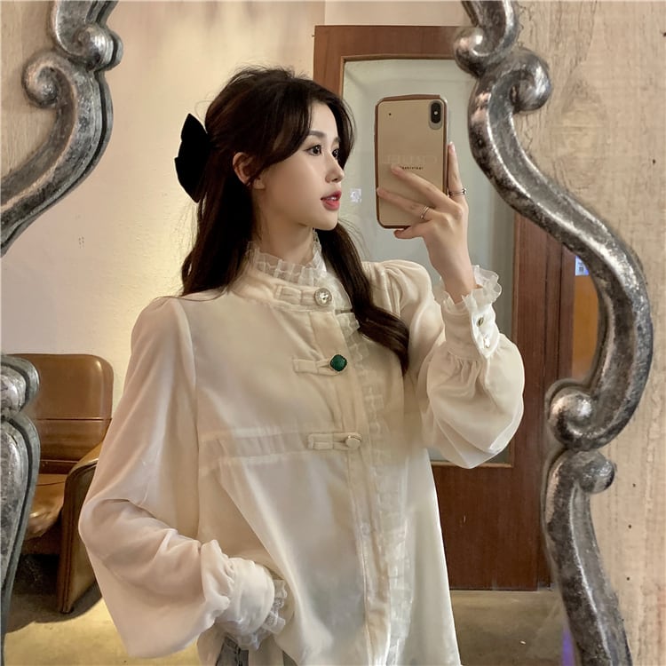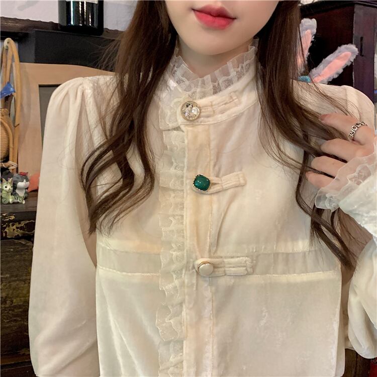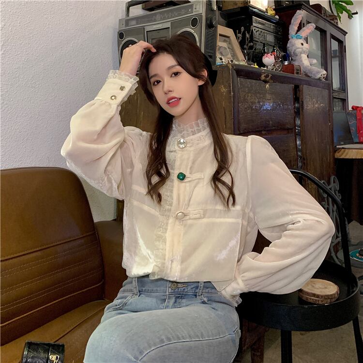 オーバーサイズ フリルトリミング ビジューボタン ドレスシャツ トップス ブラウス ミディアム丈 長袖 パフスリーブ スタンドカラー レース フリル 前開き 透け感 異素材MIX ベルベット 大人可愛い きれいめ シンプル カジュアル 上品 おしゃれ こなれ感 キュート 存在感 無地 春 秋 冬 2021 レディース 女性用 ママ 学生 通学 デート お出かけ 女子会 休日 イベント 着回し 普段使い 重ね着 韓国系 オルチャン コーデ 体系カバー 大きめ ゆったり サイズ S M L ベージュ