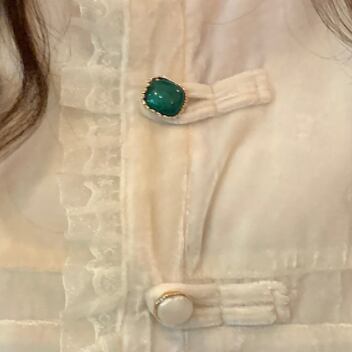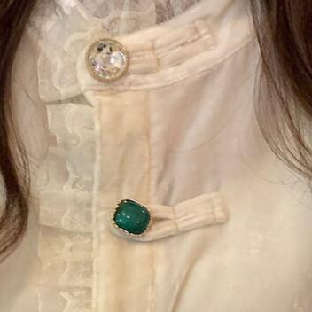 フリルトリミングとビジューボタンがアクセントとなり、キュートな雰囲気に仕上げました。また、パフスリーブが程よくボリューム感を出し、存在感のある一枚に仕上がっています。
