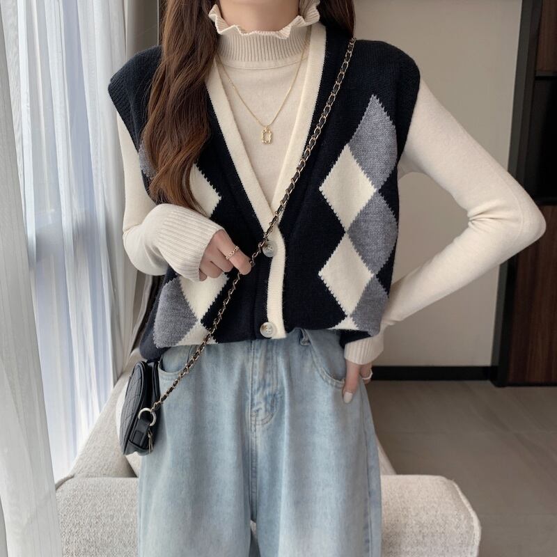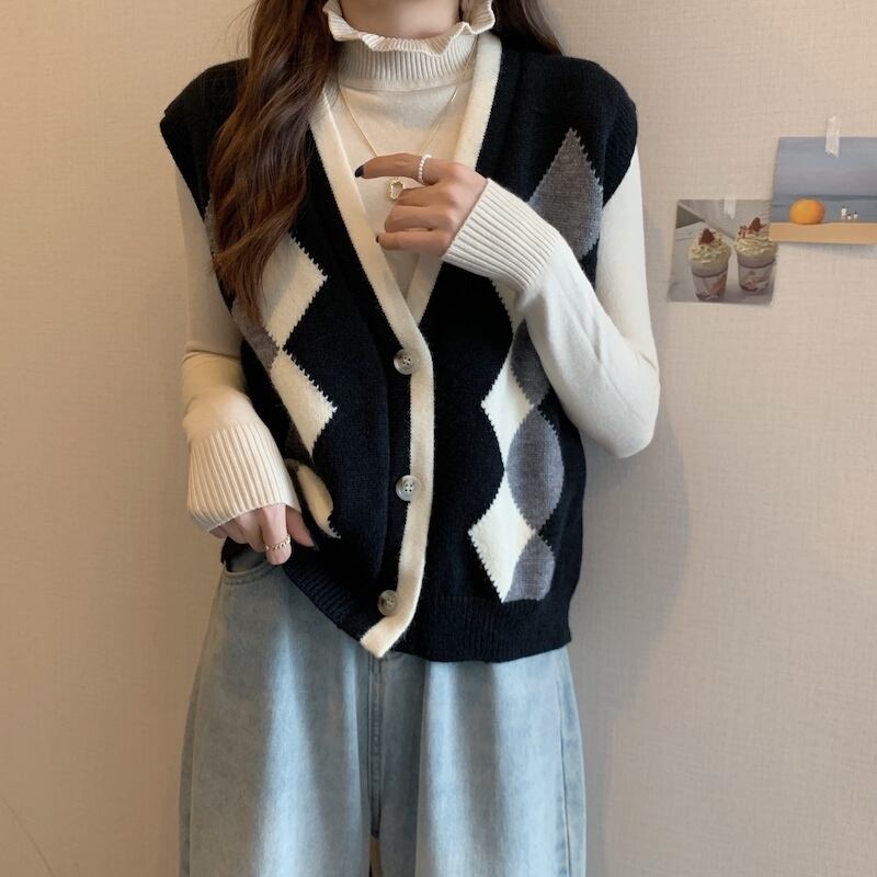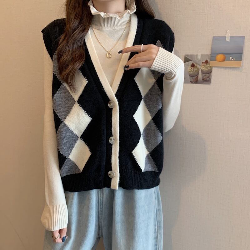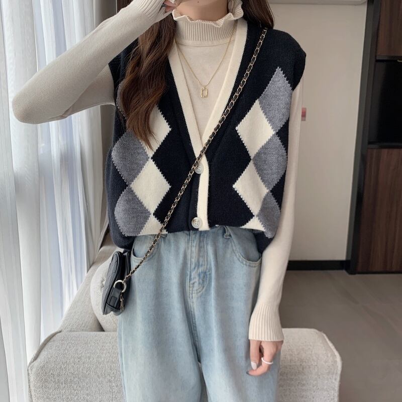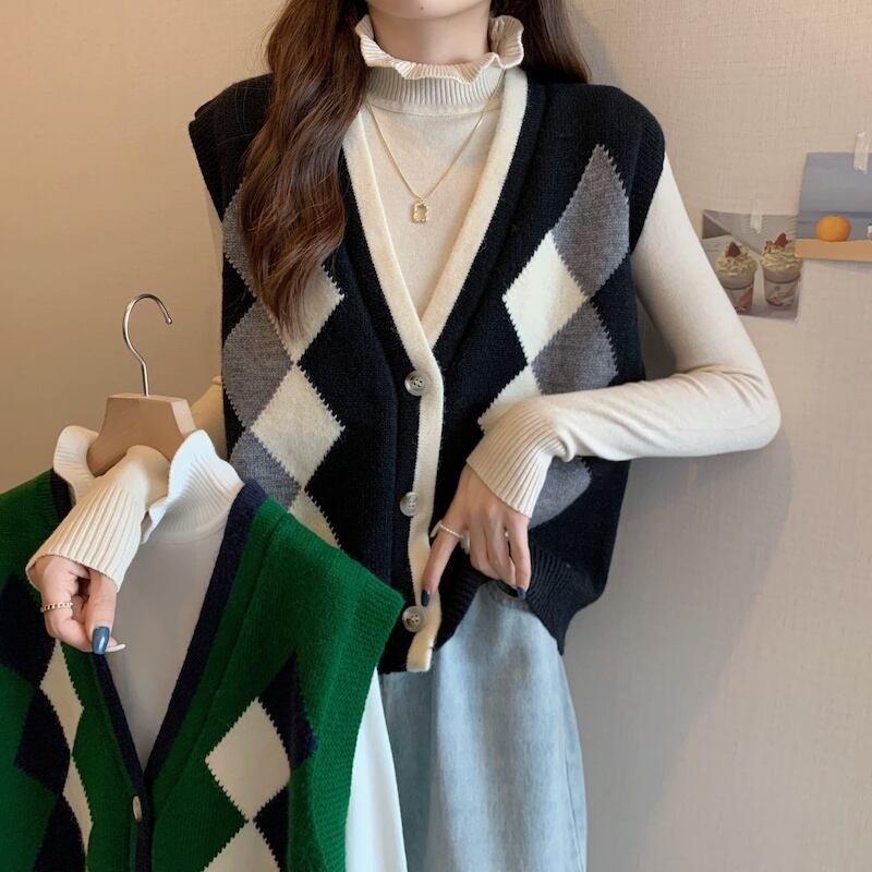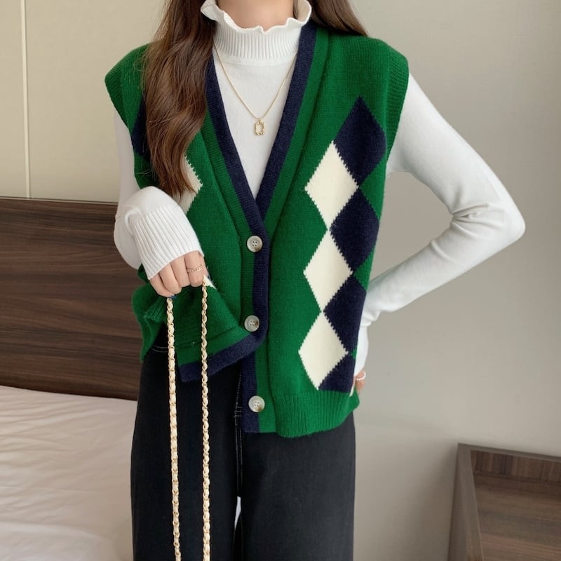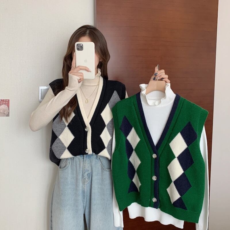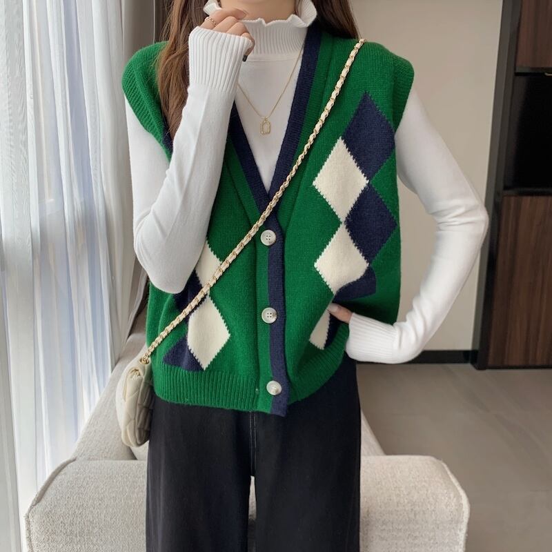 ニットベスト トップス アウター ベスト フリーサイズ 黒 ブラック 緑 グリーン ミディアム 袖なし ノースリーブ Vネック 前開き かわいい 大人可愛い きれいめ シンプル カジュアル 上品 おしゃれ ラフ 格子柄 アーガイル ひし形 ダイヤ 春 秋 冬 二次会 母の日 バレンタイン ママ OL 通勤 学生 通学 デート お出かけ 女子会 アウトドア パーティー イベント 旅行 着回し 普段使い 重ね着 韓国 オルチャン 暖かい 防寒 モテ プレゼント プチプラ トレンド カレッジ 海外