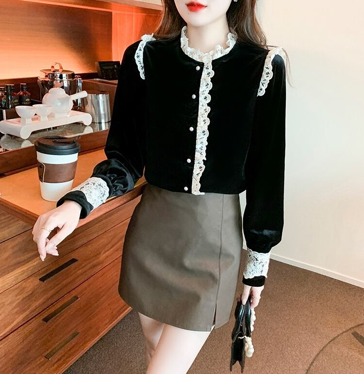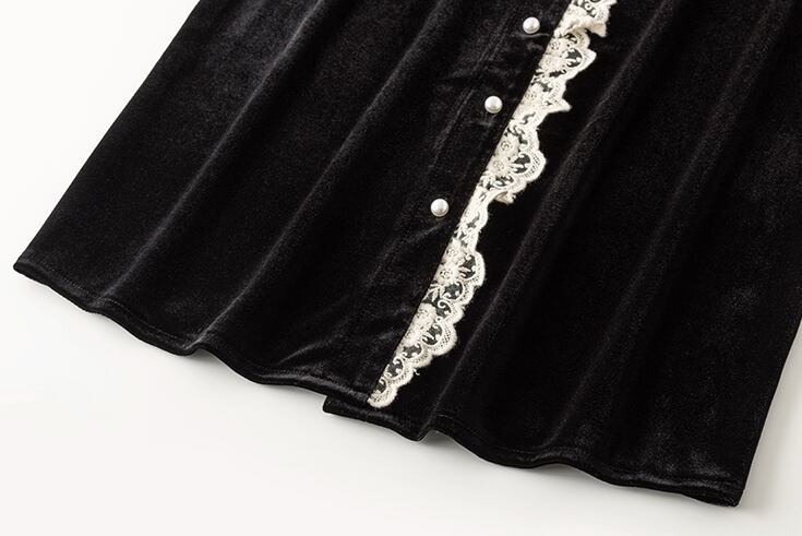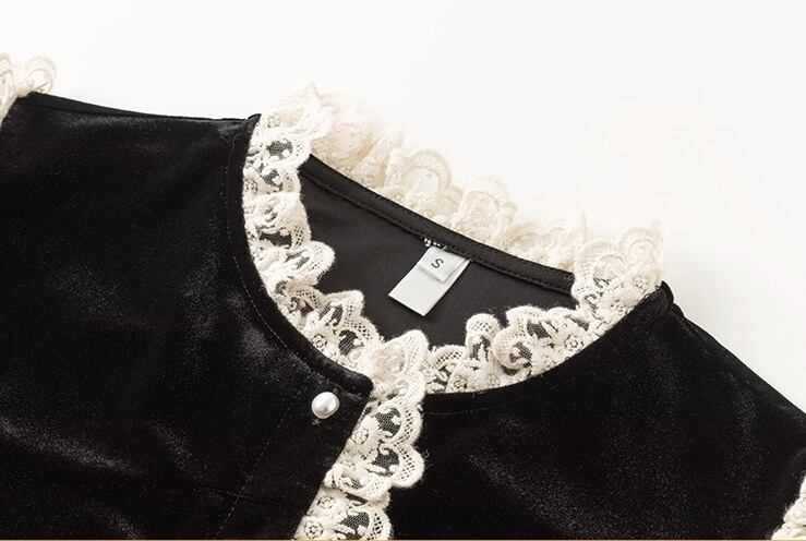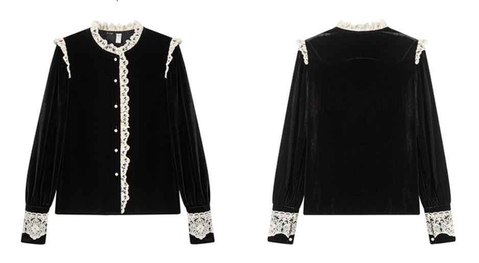 首周り・前立て部・肩山部分とカフス部にレースをあしらったバイカラー配色のベルベットカットソー。
