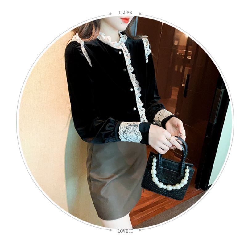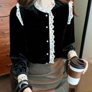 カラー配色 レーストリミング フラワーレース パール調ボタン ロングカフス トップス カットソー ミディアム丈 長袖 クルーネック レース 綿 異素材MIX ベルベット かわいい 大人可愛い きれいめ シンプル カジュアル 上品 おしゃれ お洒落 レトロ ガーリー 存在感 秋 冬 レディース 女性用 OL 通勤 学生 通学 デート お出かけ 女子会 休日 レストラン 着回し 普段使い 韓国系 オルチャン コーデ モテ 体系カバー S M L XL 2XL 大きいサイズ ゆったり サイズ ブラック