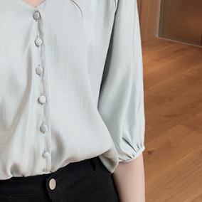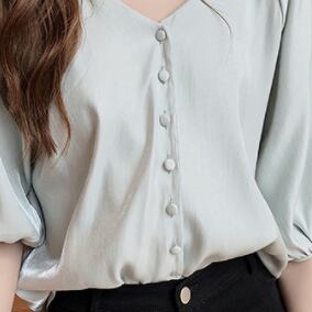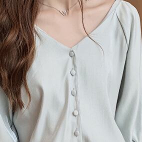 ふんわり優しいシフォン風素材のVネックブラウスです。
