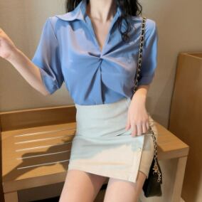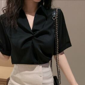 商品名「シフォンブラウス トップス」。シンプルでありながら大人可愛いデザインが魅力のブラウスです。Vネックでデコルテが綺麗に見え、シフォン素材で軽やかな印象を与えます。袖あり半袖でミドル丈のストレートシルエットが、上品でおしゃれな雰囲気を演出します。
