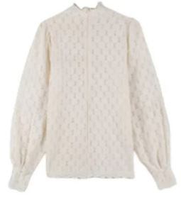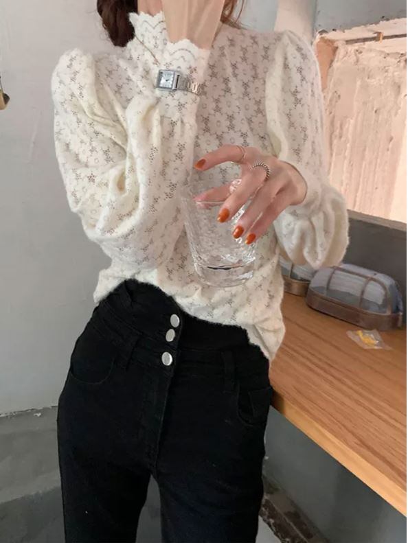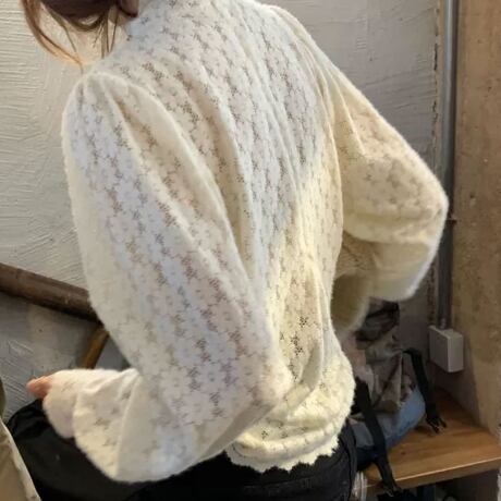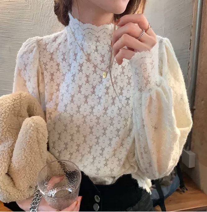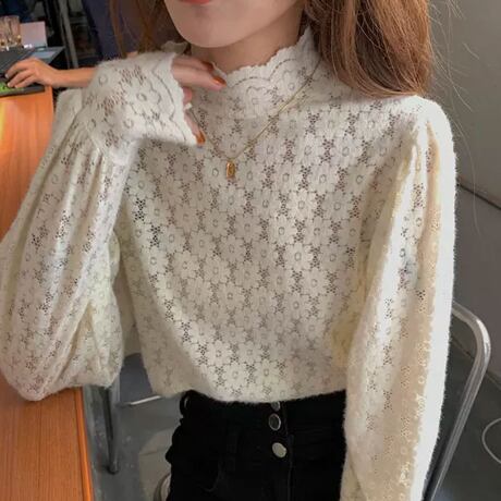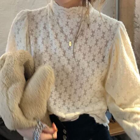 総花柄レースのハイネックブラウスです。