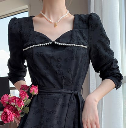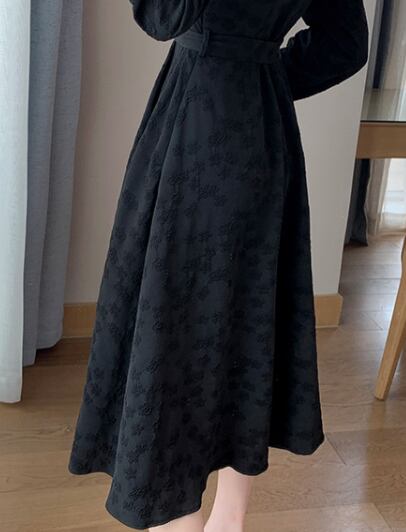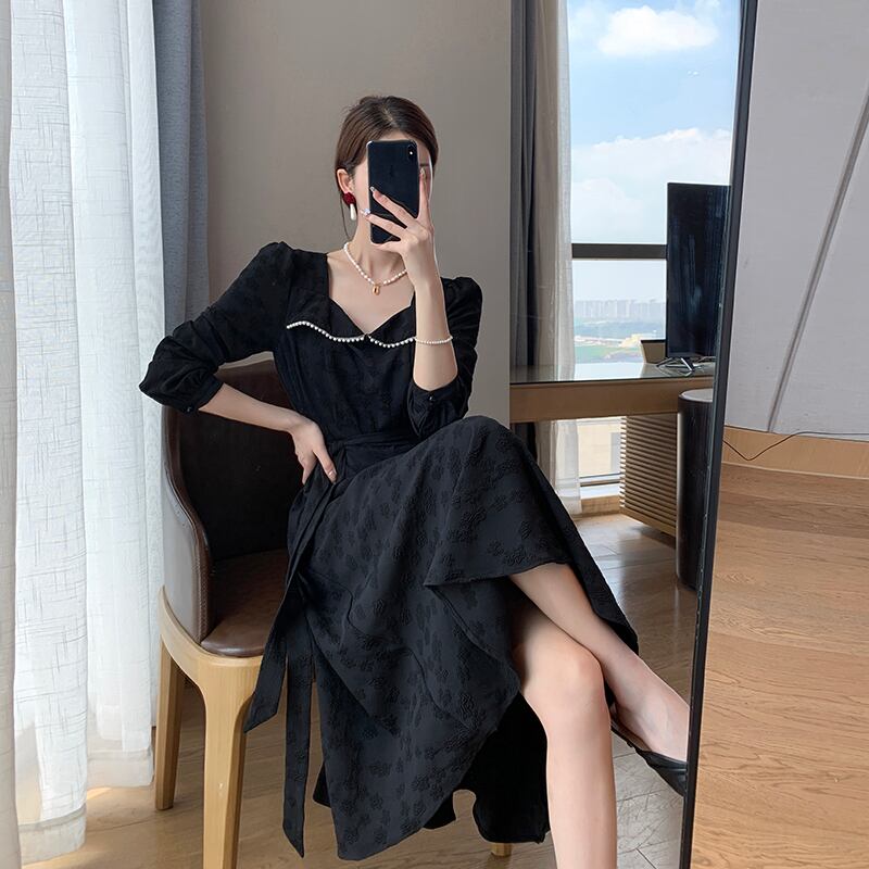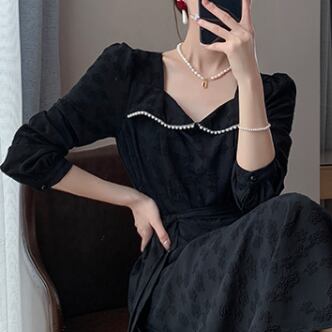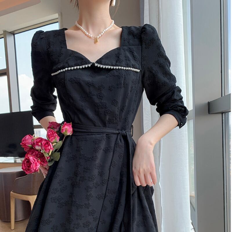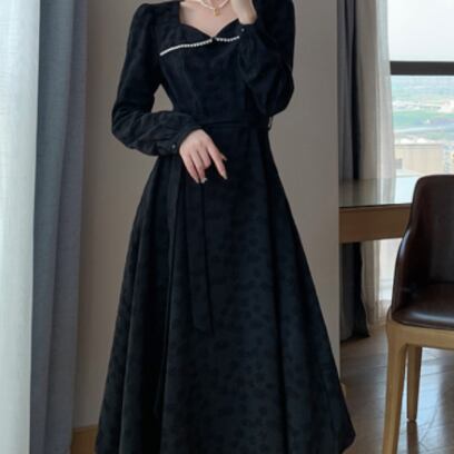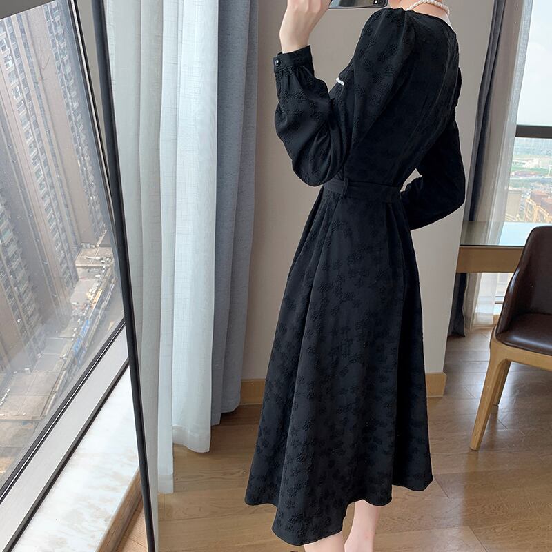 ロング ワンピース ドレス Aライン ブラック 黒 大きいサイズ クローバーサイズ レトロ 鎖骨見せ デコルテ 膝下 ミモレ丈 7分丈 袖あり 長袖 かわいい 大人可愛い きれいめ シンプル 大人 上品 おしゃれ お洒落 大人女子 こなれ感 キュート ガーリー エレガント 主役級 存在感 春 秋 2021 レディース 女性用 学生 通学 デート 休日 お出かけ 女子会 イベント 旅行 着回し 普段使い 定番 韓国系 モテ トレンド 流行 インスタ映え おすすめ インポート L XL 2XL 3XL 4XL