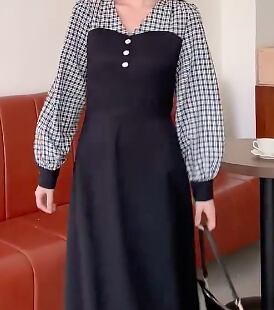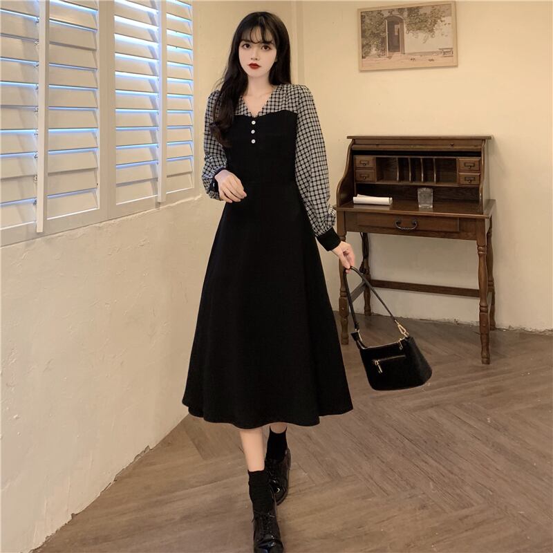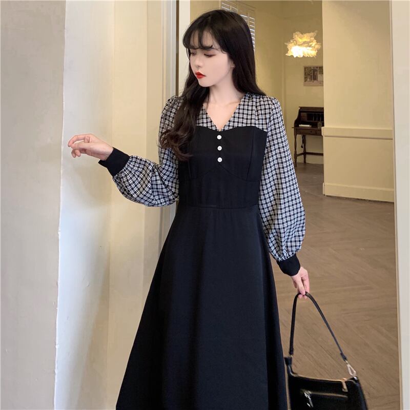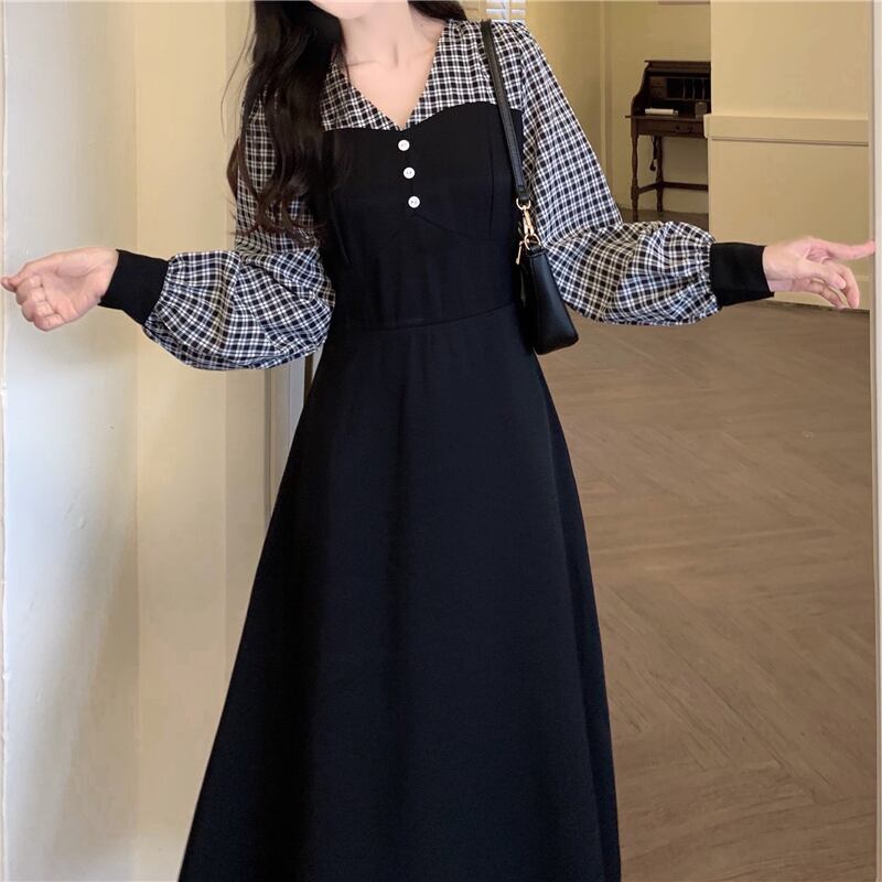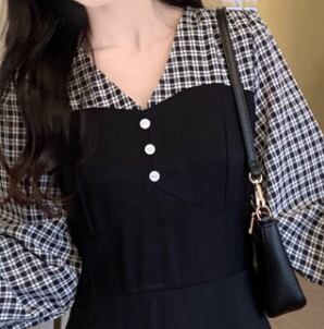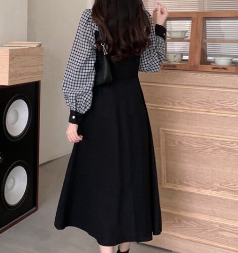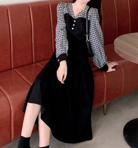 ドッキング Aライン レトロ チェック ロング丈 ワンピース ブラック 黒 お嬢様 清楚 膝下 袖あり 長袖 ボリューム袖 Vネック かわいい 大人可愛い きれいめ シンプル カジュアル 大人 上品 おしゃれ お洒落 大人女子 こなれ感 キュート ガーリー 主役級 存在感 春 秋 2021 レディース 女性用 学生 通学 デート 休日 お出かけ 女子会 イベント 旅行 着回し 普段使い 定番 韓国系 モテ トレンド 流行 インスタ映え おすすめ インポート ギフト M L XL 2XL 3XL 4XL