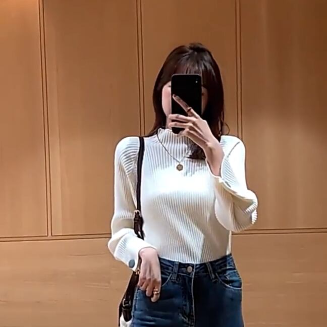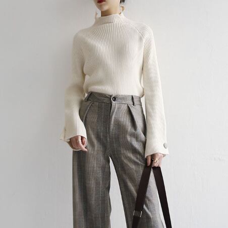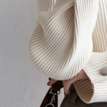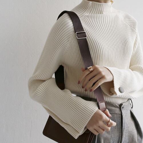 たくさんあるニットの中でも、一目で主役になれるハイネックニットソーが新登場。ミドル丈で着やすく、袖丈はちょうどいい長さ。ベルスリーブが女性らしさを演出し、ハイネックが大人っぽく、リブニットでシンプルながら高級感があります。