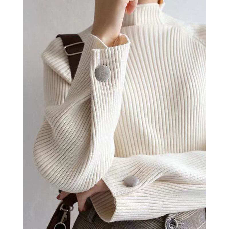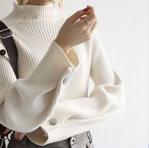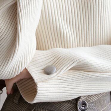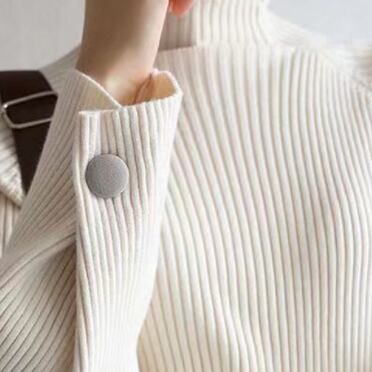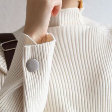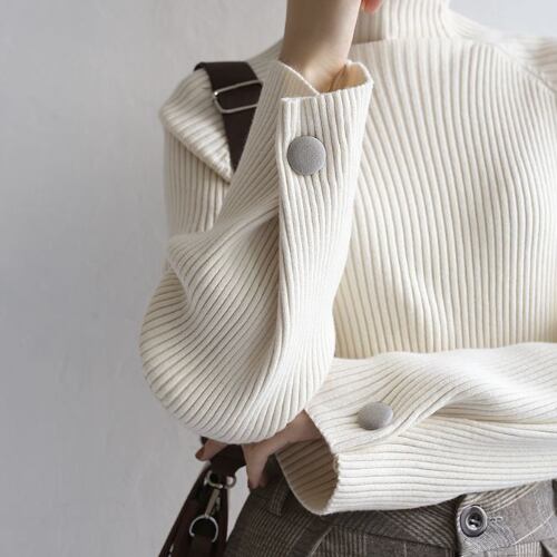 袖口の大きなボタンがインパクトのあるハイネックニットセータです。