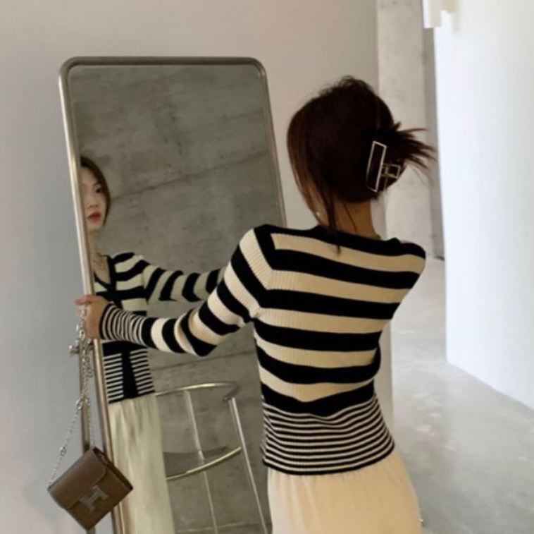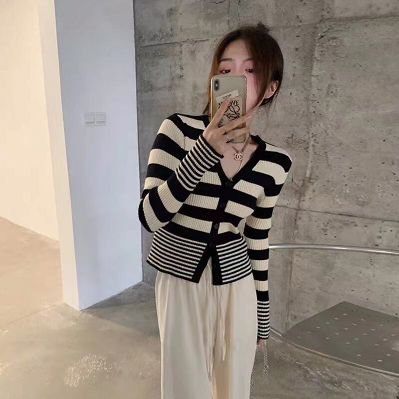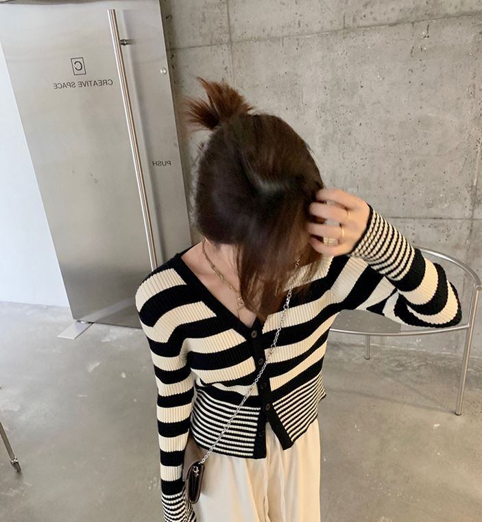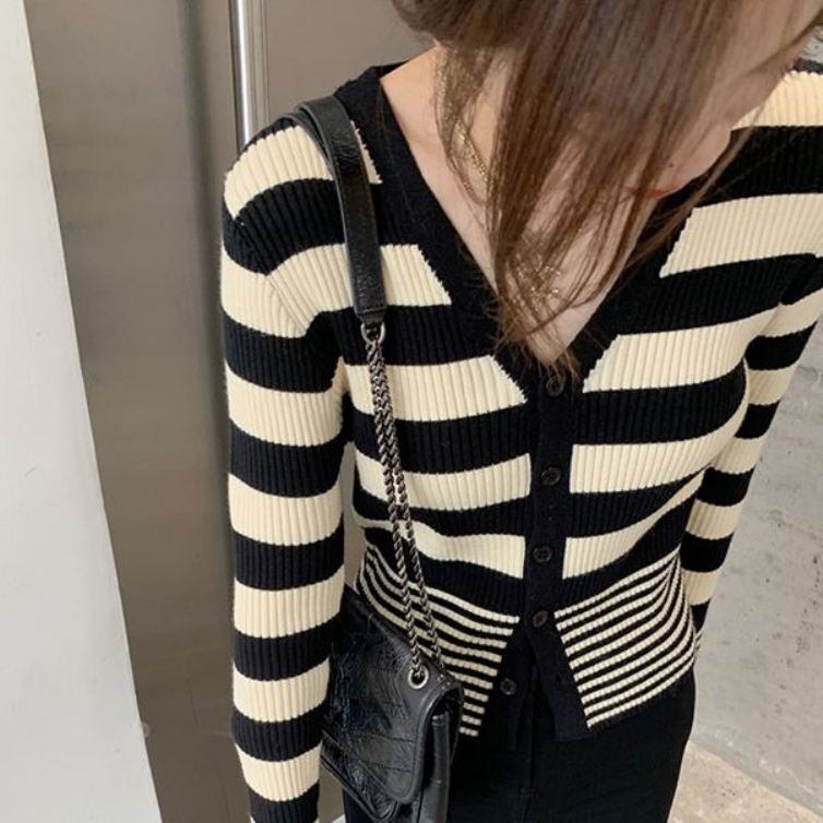 切替えボーダー クロップド すっきり トップス ニットソー セーター カーディガン ショート丈 長袖 Vネック スリム タイト 細身 切り替えデザイン スマート リブ 前開き ニット シンプル カジュアル 上品 おしゃれ お洒落 かっこいい 大人女子 クール 存在感 ボーダー シマ 春 秋 冬 2021 レディース 女性用 ママ 女の子 学生 通学 デート お出かけ 女子会 休日 旅行 着回し 普段使い 韓国系 オルチャン ファッション コーデ スタイル 脚長 S M L ブラック モノトーン