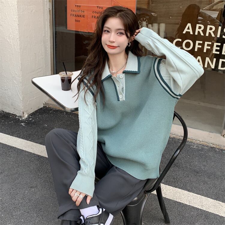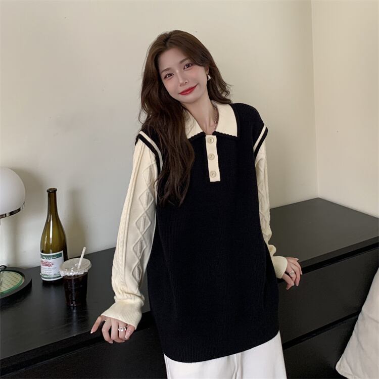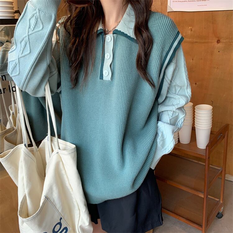 重ね着風 トップス セーター プルオーバー 黒 ブラック 緑 グリーン ピンク ミディアム丈 長袖 襟付き ポロカラー 切り替えデザイン ボタン ツーピース かわいい 大人可愛い シンプル カジュアル おしゃれ 大人女子 こなれ感 ラフ ルーズ 個性的 主役級 存在感 抜け感 無地 春 秋 2022 10代 20代 レディース 通勤 通学 デート お出かけ 女子会 休日 着回し 普段使い お揃い 双子 ファッション コーデ スタイル 楽ちん 新作 トレンド フリーサイズ ゆったり ゆる 色展開