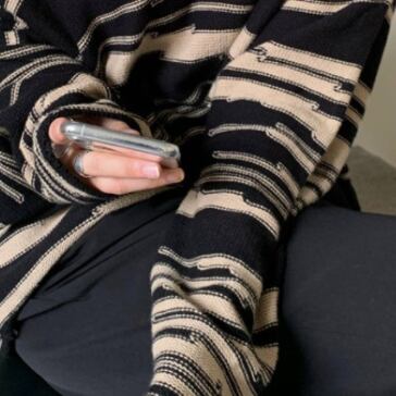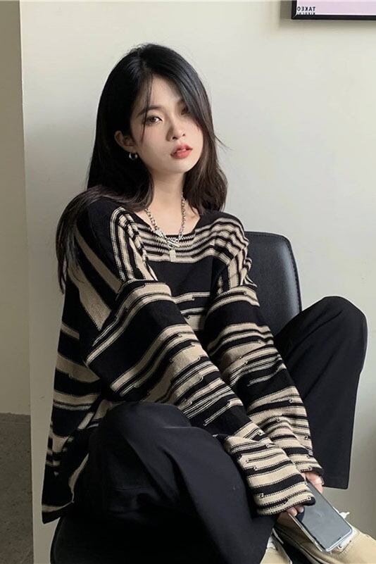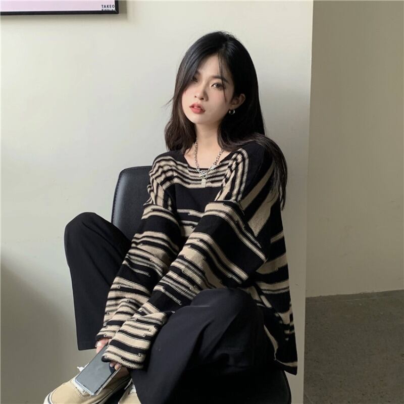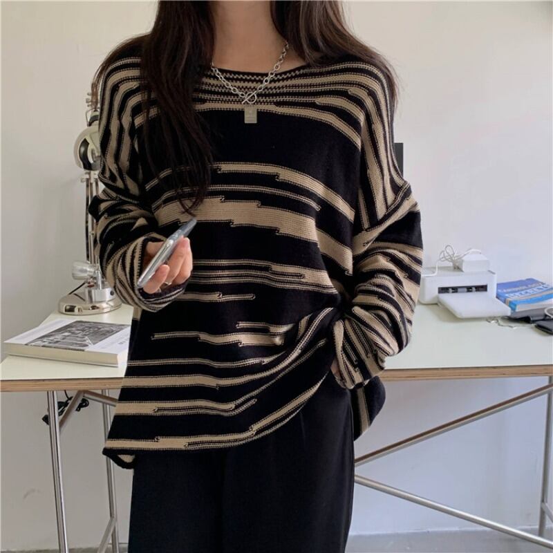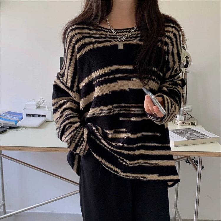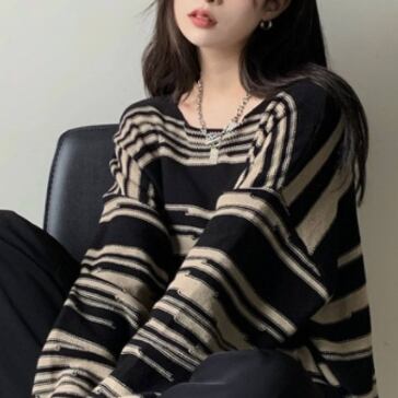 バイカラーの柄が大人っぽいニットトップスです。
