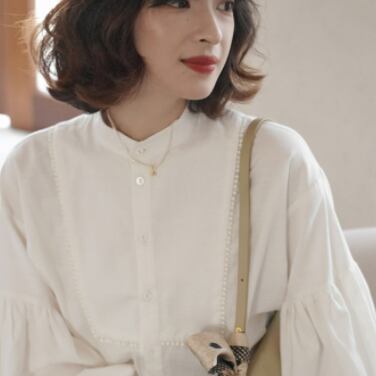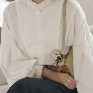 商品名にもあるように、大き目のパフスリーブが印象的な一枚。シンプルながら袖のボリューム感で存在感があり、着こなしの主役になること間違いなしです。レトロ風のデザインは、上品さも感じさせるエレガントな印象。カジュアルな着こなしにも、きれいめなオフィススタイルにもマッチします。ベーシックなホワイトは色違いで揃えたくなる定番アイテム!さらに、スタイルアップ効果も期待できるので、体型カバーにも最適です。生地は上質なコットンを使用し、丁寧なつくりで長く着用していただけるようにしています。幅広い年代に対応し、季節を問わずに利用できる、きれいめシンプルな一枚。是非、お手元に置いてみてください。