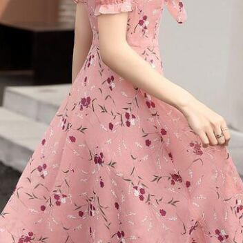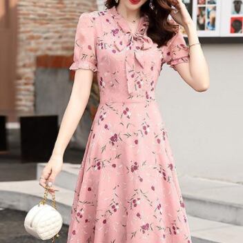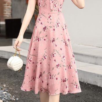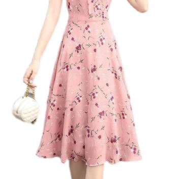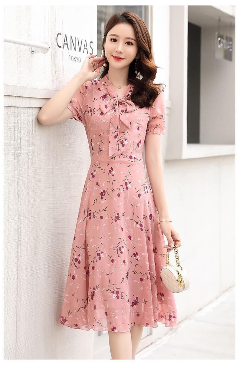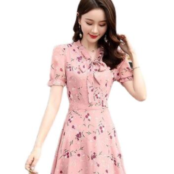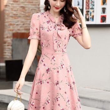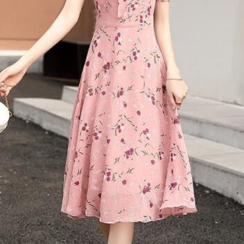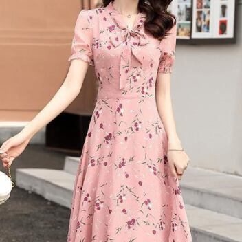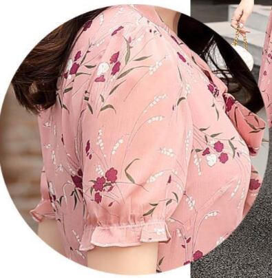 シフォンワンピース ワンピ ガーリー ラブリー ピンク ミディアム丈 袖あり 半袖 Vネック フレア スリム 細身 タイト リボン シフォン 大人女子 大人 上品 おしゃれ エレガント レトロ レトロ風 こなれ感 ラフ キュート かわいい 女子 個性的 デザイン 主役級 存在感 柄 花柄 フラワー 夏 サマー 10代 20代 30代 レディース 女性用 学生 通学 デート お出かけ 女子会 着回し 普段使い 3XL 4XL 大きいサイズ プラスサイズ M L XL 2XL